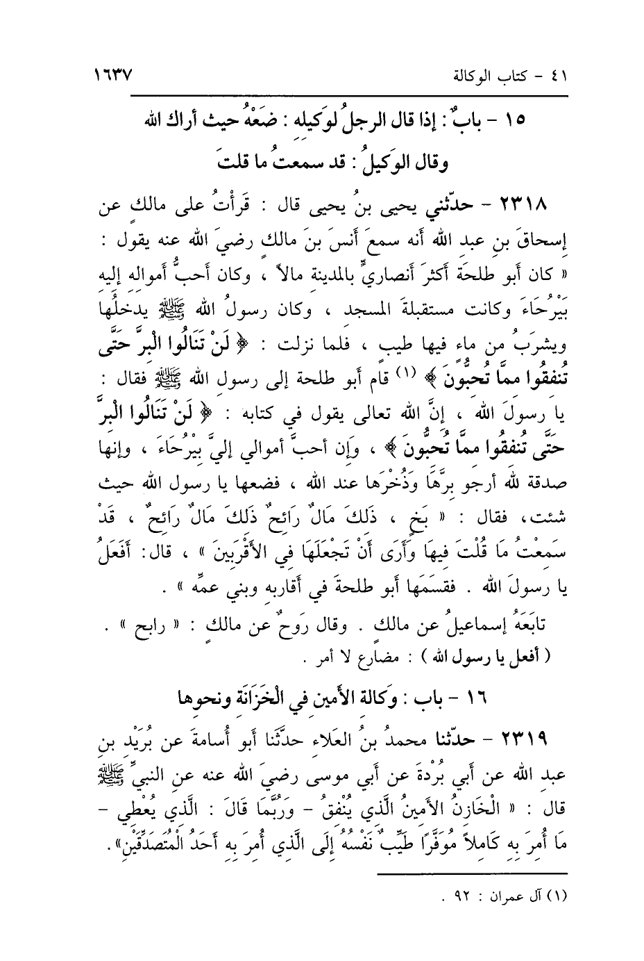 2318 - حَدَّثَنِي يَحْيَى بْنُ يَحْيَى، قَالَ: قَرَأْتُ عَلَى مَالِكٍ، عَنْ إِسْحَاقَ بْنِ عَبْدِ اللَّهِ، أَنَّهُ سَمِعَ أَنَسَ بْنَ مَالِكٍ رَضِيَ اللَّهُ عَنْهُ، يَقُولُ: كَانَ أَبُو طَلْحَةَ أَكْثَرَ الأَنْصَارِ بِالْمَدِينَةِ مَالًا، وَكَانَ أَحَبَّ أَمْوَالِهِ إِلَيْهِ بَيْرُحَاءَ، وَكَانَتْ مُسْتَقْبِلَةَ المَسْجِدِ، وَكَانَ رَسُولُ اللَّهِ صَلَّى اللهُ عَلَيْهِ وَسَلَّمَ يَدْخُلُهَا وَيَشْرَبُ مِنْ مَاءٍ فِيهَا طَيِّبٍ، فَلَمَّا نَزَلَتْ: {لَنْ تَنَالُوا البِرَّ حَتَّى تُنْفِقُوا مِمَّا تُحِبُّونَ} [سورة: آل عمران، آية رقم: 92] قَامَ أَبُو طَلْحَةَ إِلَى رَسُولِ اللَّهِ صَلَّى اللهُ عَلَيْهِ وَسَلَّمَ، فَقَالَ: يَا رَسُولَ اللَّهِ، إِنَّ اللَّهَ تَعَالَى يَقُولُ فِي كِتَابِهِ: {لَنْ تَنَالُوا البِرَّ حَتَّى تُنْفِقُوا مِمَّا تُحِبُّونَ} [سورة: آل عمران، آية رقم: 92] وَإِنَّ أَحَبَّ أَمْوَالِي إِلَيَّ بَيْرُحَاءَ، وَإِنَّهَا صَدَقَةٌ لِلَّهِ أَرْجُو بِرَّهَا، وَذُخْرَهَا عِنْدَ اللَّهِ، فَضَعْهَا يَا رَسُولَ اللَّهِ حَيْثُ شِئْتَ، فَقَالَ: «بَخٍ، ذَلِكَ مَالٌ رَائِحٌ، ذَلِكَ مَالٌ رَائِحٌ، قَدْ سَمِعْتُ مَا قُلْتَ فِيهَا، وَأَرَى أَنْ تَجْعَلَهَا فِي الأَقْرَبِينَ»، قَالَ: أَفْعَلُ يَا رَسُولَ اللَّهِ، فَقَسَمَهَا أَبُو طَلْحَةَ فِي أَقَارِبِهِ وَبَنِي عَمِّهِ، تَابَعَهُ إِسْمَاعِيلُ، عَنْ مَالِكٍ، وَقَالَ رَوْحٌ، عَنْ مَالِكٍ: «رَابِحٌ».
