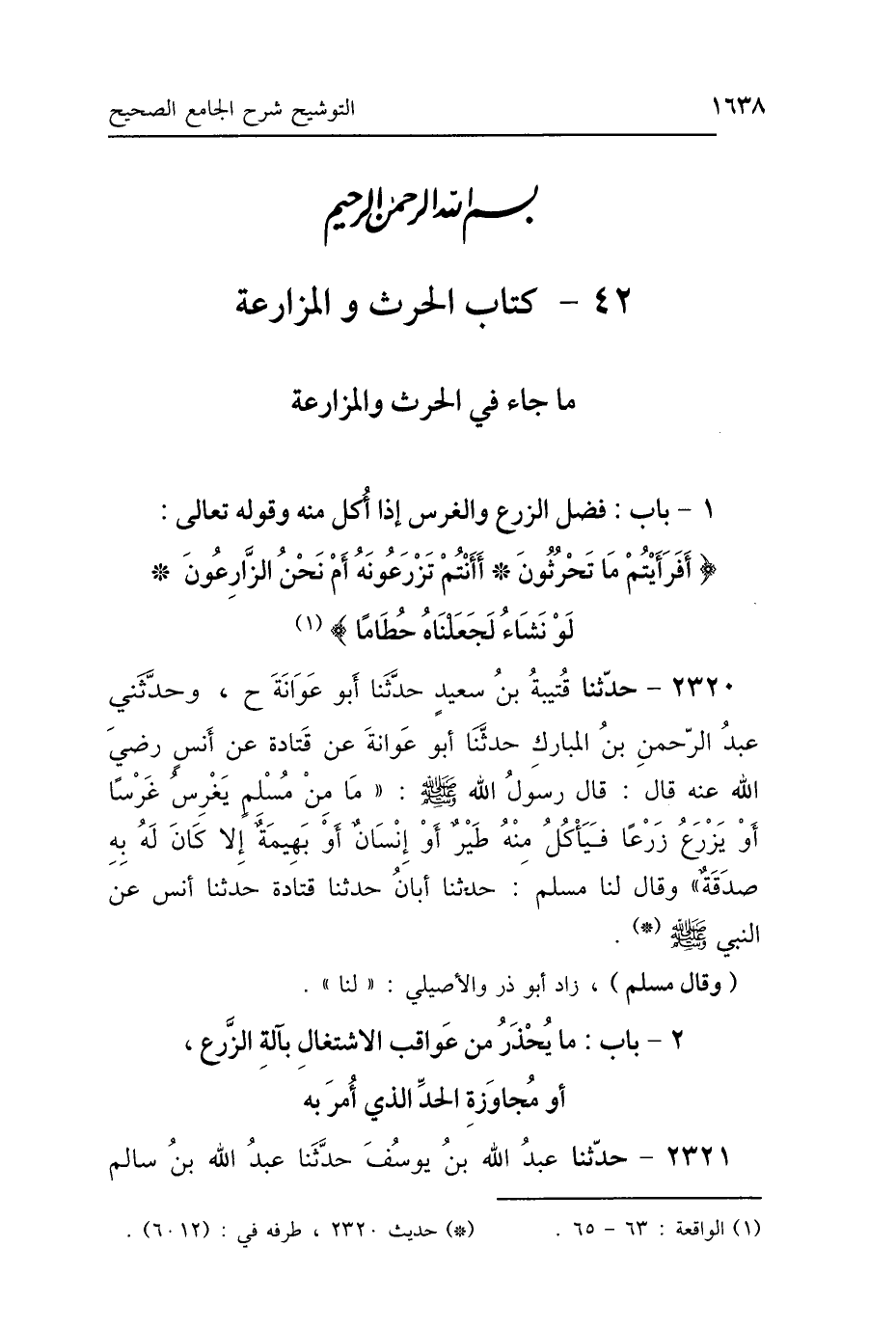 1 - بَابُ فَضْلِ الزَّرْعِ وَالغَرْسِ إِذَا أُكِلَ مِنْهُ وَقَوْلِ اللَّهِ تَعَالَى: {أَفَرَأَيْتُمْ مَا تَحْرُثُونَ، أَأَنْتُمْ تَزْرَعُونَهُ أَمْ نَحْنُ الزَّارِعُونَ، لَوْ نَشَاءُ لَجَعَلْنَاهُ حُطَامًا} [الواقعة: 64]