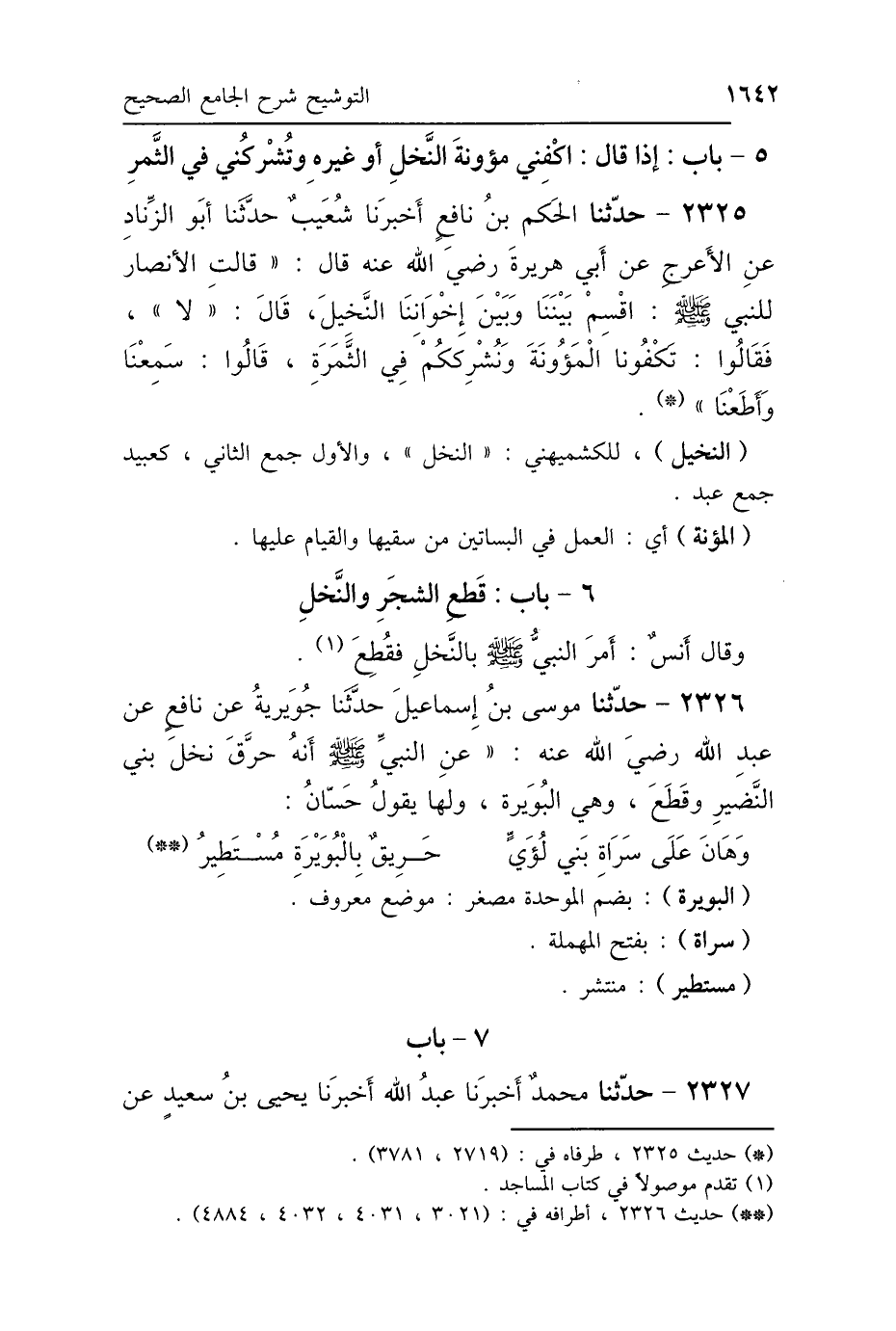 2326 - حَدَّثَنَا مُوسَى بْنُ إِسْمَاعِيلَ، حَدَّثَنَا جُوَيْرِيَةُ، عَنْ نَافِعٍ، عَنْ عَبْدِ اللَّهِ رَضِيَ اللَّهُ عَنْهُ، عَنِ النَّبِيِّ صَلَّى اللهُ عَلَيْهِ وَسَلَّمَ: «أَنَّهُ حَرَّقَ نَخْلَ بَنِي النَّضِيرِ، وَقَطَعَ»، وَهِيَ البُوَيْرَةُ، وَلَهَا يَقُولُ حَسَّانُ: