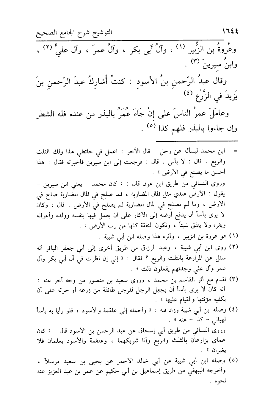 وَعُرْوَةُ، وَآلُ أَبِي بَكْرٍ، وَآلُ عُمَرَ، وَآلُ عَلِيٍّ، وَابْنُ سِيرِينَ وَقَالَ عَبْدُ الرَّحْمَنِ بْنُ الأَسْوَدِ: «كُنْتُ أُشَارِكُ عَبْدَ الرَّحْمَنِ بْنَ يَزِيدَ فِي الزَّرْعِ» وَعَامَلَ عُمَرُ، «النَّاسَ عَلَى إِنْ جَاءَ عُمَرُ بِالْبَذْرِ مِنْ عِنْدِهِ فَلَهُ الشَّطْرُ، وَإِنْ جَاءُوا بِالْبَذْرِ فَلَهُمْ كَذَا».