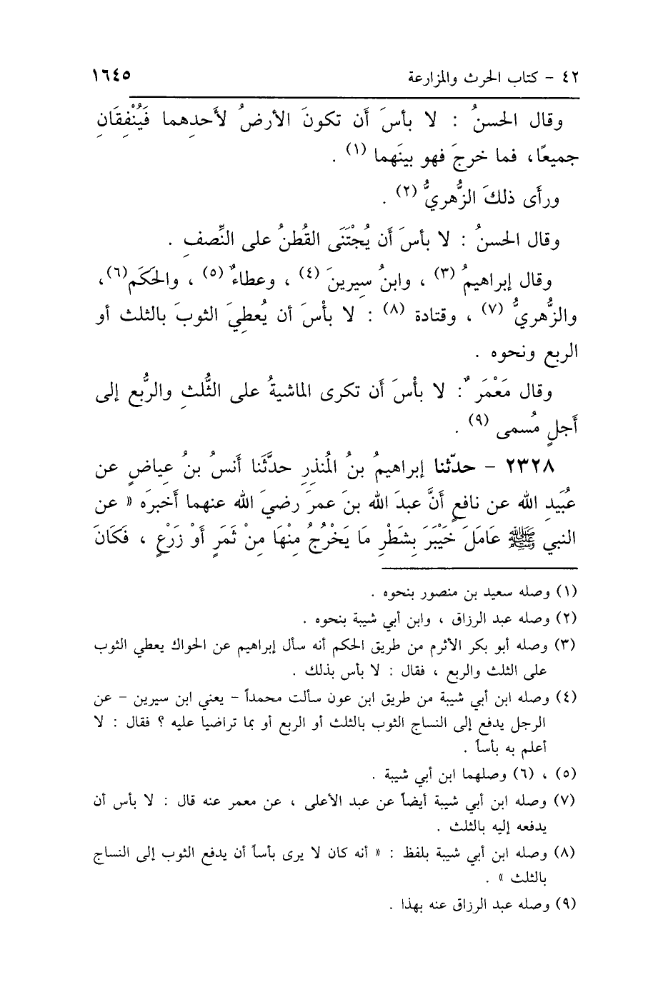 وَقَالَ الحَسَنُ: «لاَ بَأْسَ أَنْ تَكُونَ الأَرْضُ لِأَحَدِهِمَا، فَيُنْفِقَانِ جَمِيعًا، فَمَا خَرَجَ فَهُوَ بَيْنَهُمَا» وَرَأَى ذَلِكَ الزُّهْرِيُّ وَقَالَ الحَسَنُ: «لاَ بَأْسَ أَنْ يُجْتَنَى القُطْنُ عَلَى النِّصْفِ» وَقَالَ إِبْرَاهِيمُ، وَابْنُ سِيرِينَ، وَعَطَاءٌ، وَالحَكَمُ، وَالزُّهْرِيُّ، وَقَتَادَةُ: «لاَ بَأْسَ أَنْ يُعْطِيَ الثَّوْبَ بِالثُّلُثِ أَوِ الرُّبُعِ» وَنَحْوِهِ وَقَالَ مَعْمَرٌ: «لاَ بَأْسَ أَنْ تَكُونَ المَاشِيَةُ عَلَى الثُّلُثِ، وَالرُّبُعِ إِلَى أَجَلٍ مُسَمًّى».