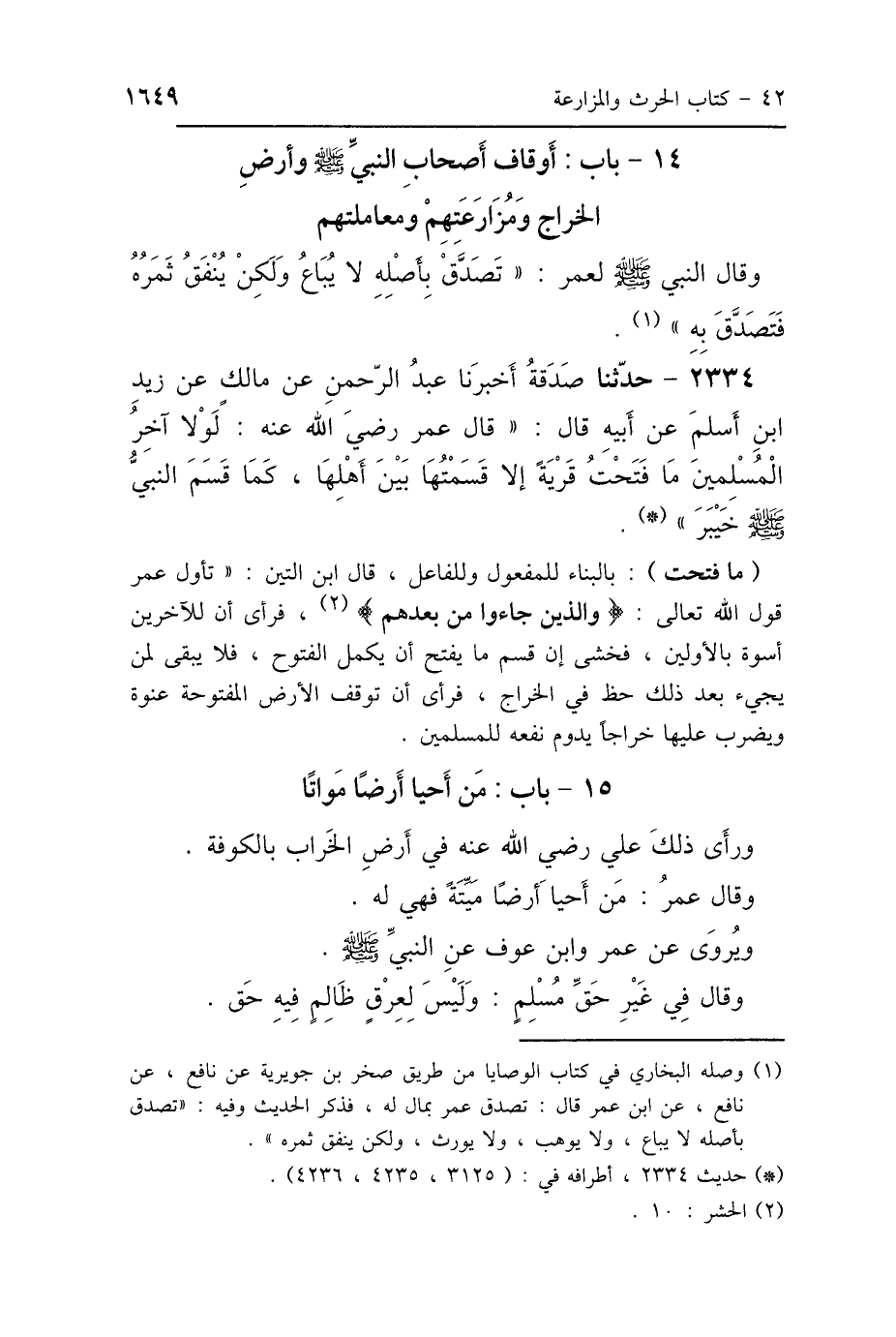 2334 - حَدَّثَنَا صَدَقَةُ، أَخْبَرَنَا عَبْدُ الرَّحْمَنِ، عَنْ مَالِكٍ، عَنْ زَيْدِ بْنِ أَسْلَمَ، عَنْ أَبِيهِ، قَالَ: قَالَ عُمَرُ رَضِيَ اللَّهُ عَنْهُ: «لَوْلاَ آخِرُ المُسْلِمِينَ، مَا فَتَحْتُ قَرْيَةً إِلَّا قَسَمْتُهَا بَيْنَ أَهْلِهَا، كَمَا قَسَمَ النَّبِيُّ صَلَّى اللهُ عَلَيْهِ وَسَلَّمَ خَيْبَرَ».