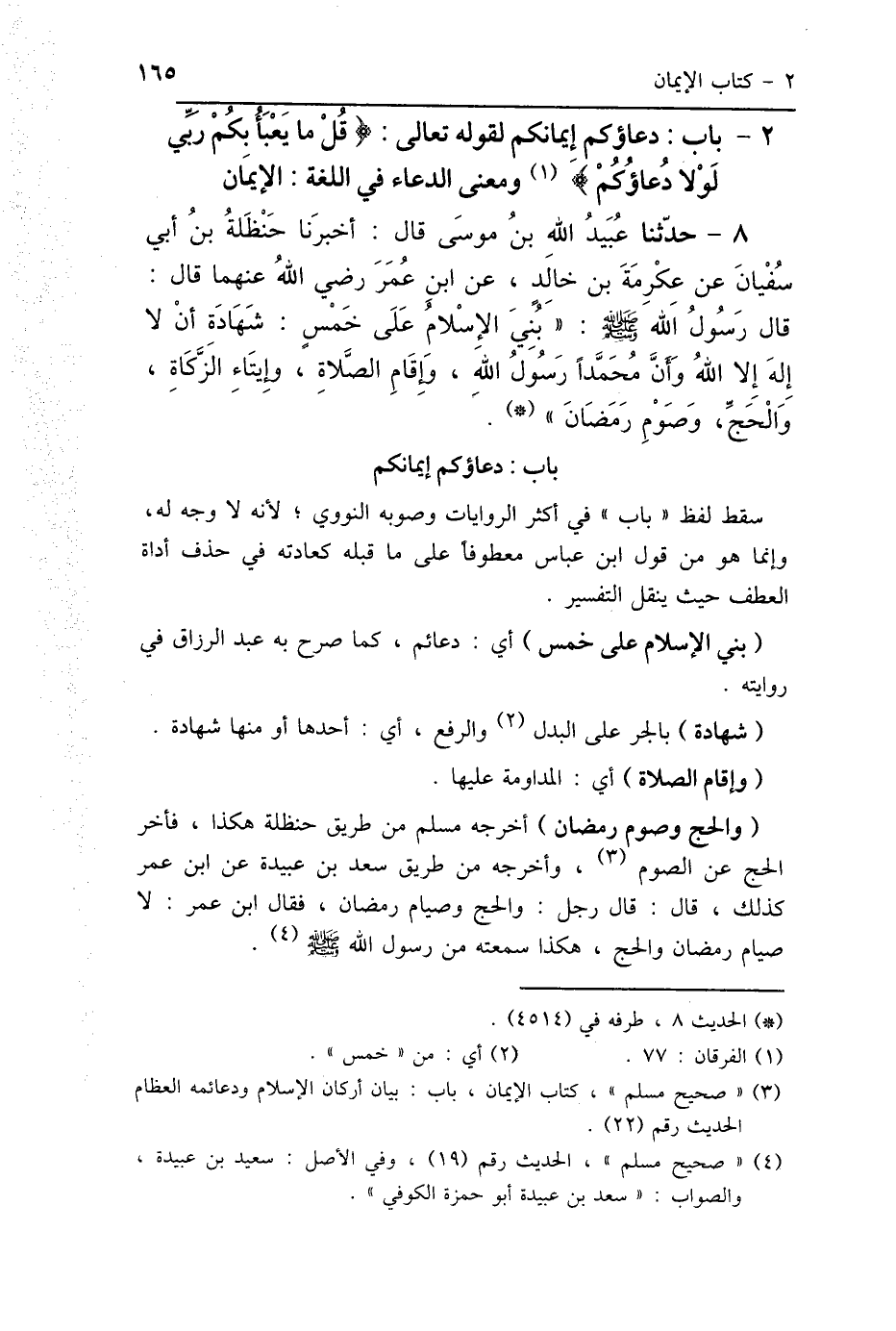 2 - باب دُعَاؤُكُمْ إِيمَانُكُمْ لِقَوْلِهِ عَزَّ وَجَلَّ: {قُلْ مَا يَعْبَأُ بِكُمْ رَبِّي لَوْلاَ دُعَاؤُكُمْ} [الفرقان: 77] وَمَعْنَى الدُّعَاءِ فِي اللُّغَةِ الإِيمَانُ