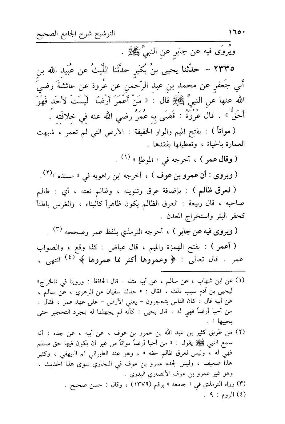 2335 - حَدَّثَنَا يَحْيَى بْنُ بُكَيْرٍ، حَدَّثَنَا اللَّيْثُ، عَنْ عُبَيْدِ اللَّهِ بْنِ أَبِي جَعْفَرٍ، عَنْ مُحَمَّدِ بْنِ عَبْدِ الرَّحْمَنِ، عَنْ عُرْوَةَ، عَنْ عَائِشَةَ رَضِيَ اللَّهُ عَنْهَا، عَنِ النَّبِيِّ صَلَّى اللهُ عَلَيْهِ وَسَلَّمَ قَالَ: «مَنْ أَعْمَرَ أَرْضًا لَيْسَتْ لِأَحَدٍ فَهُوَ أَحَقُّ»، قَالَ عُرْوَةُ: «قَضَى بِهِ عُمَرُ رَضِيَ اللَّهُ عَنْهُ فِي خِلاَفَتِهِ».