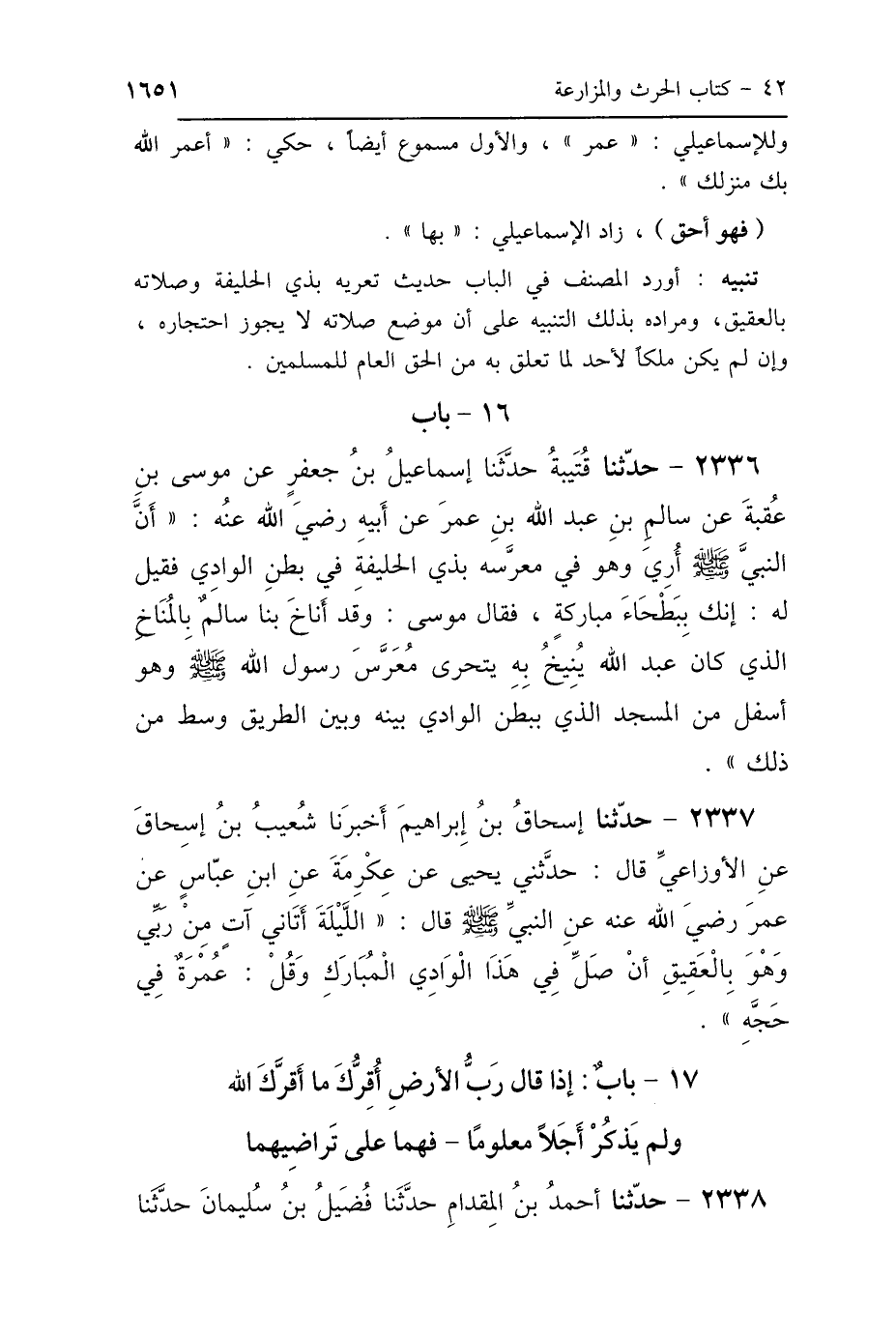 2336 - حَدَّثَنَا قُتَيْبَةُ، حَدَّثَنَا إِسْمَاعِيلُ بْنُ جَعْفَرٍ، عَنْ مُوسَى بْنِ عُقْبَةَ، عَنْ سَالِمِ بْنِ عَبْدِ اللَّهِ بْنِ عُمَرَ، عَنْ أَبِيهِ رَضِيَ اللَّهُ عَنْهُ: أَنَّ النَّبِيَّ صَلَّى اللهُ عَلَيْهِ وَسَلَّمَ أُرِيَ وَهُوَ فِي مُعَرَّسِهِ مِنْ ذِي الحُلَيْفَةِ فِي بَطْنِ الوَادِي، فَقِيلَ لَهُ: «إِنَّكَ بِبَطْحَاءَ مُبَارَكَةٍ»، فَقَالَ مُوسَى: وَقَدْ أَنَاخَ بِنَا سَالِمٌ بِالْمُنَاخِ الَّذِي «كَانَ عَبْدُ اللَّهِ يُنِيخُ بِهِ، يَتَحَرَّى مُعَرَّسَ رَسُولِ اللَّهِ صَلَّى اللهُ عَلَيْهِ وَسَلَّمَ، وَهُوَ أَسْفَلُ مِنَ المَسْجِدِ الَّذِي بِبَطْنِ الوَادِي، بَيْنَهُ وَبَيْنَ الطَّرِيقِ وَسَطٌ مِنْ ذَلِكَ».