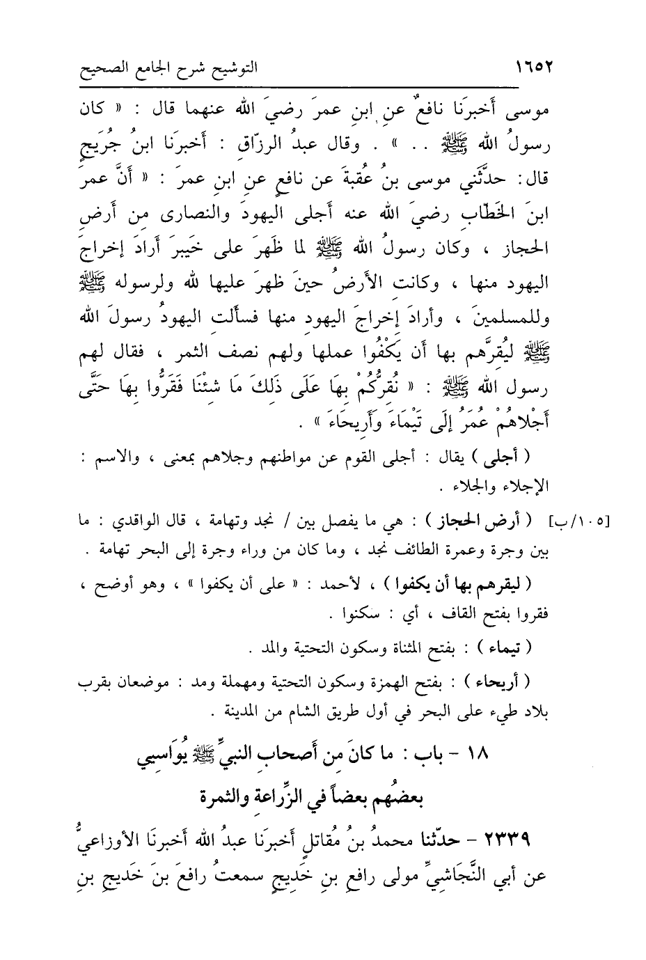 مُوسَى، أَخْبَرَنَا نَافِعٌ، عَنِ ابْنِ عُمَرَ رَضِيَ اللَّهُ عَنْهُمَا، قَالَ: كَانَ رَسُولُ اللَّهِ صَلَّى اللهُ عَلَيْهِ وَسَلَّمَ، وَقَالَ عَبْدُ الرَّزَّاقِ: أَخْبَرَنَا ابْنُ جُرَيْجٍ، قَالَ: حَدَّثَنِي مُوسَى بْنُ عُقْبَةَ، عَنْ نَافِعٍ، عَنْ ابْنِ عُمَرَ، أَنَّ عُمَرَ بْنَ الخَطَّابِ رَضِيَ اللَّهُ عَنْهُمَا: أَجْلَى اليَهُودَ، وَالنَّصَارَى مِنْ أَرْضِ الحِجَازِ، وَكَانَ رَسُولُ اللَّهِ صَلَّى اللهُ عَلَيْهِ وَسَلَّمَ لَمَّا ظَهَرَ عَلَى خَيْبَرَ أَرَادَ إِخْرَاجَ اليَهُودِ مِنْهَا، وَكَانَتِ الأَرْضُ حِينَ ظَهَرَ عَلَيْهَا لِلَّهِ وَلِرَسُولِهِ صَلَّى اللهُ عَلَيْهِ وَسَلَّمَ وَلِلْمُسْلِمِينَ، وَأَرَادَ إِخْرَاجَ اليَهُودِ مِنْهَا، فَسَأَلَتِ اليَهُودُ رَسُولَ اللَّهِ صَلَّى اللهُ عَلَيْهِ وَسَلَّمَ لِيُقِرَّهُمْ بِهَا، أَنْ يَكْفُوا عَمَلَهَا، وَلَهُمْ نِصْفُ الثَّمَرِ، فَقَالَ لَهُمْ رَسُولُ اللَّهِ صَلَّى اللهُ عَلَيْهِ وَسَلَّمَ: «نُقِرُّكُمْ بِهَا عَلَى ذَلِكَ مَا شِئْنَا»، فَقَرُّوا بِهَا حَتَّى أَجْلاَهُمْ عُمَرُ إِلَى تَيْمَاءَ وَأَرِيحَاءَ.