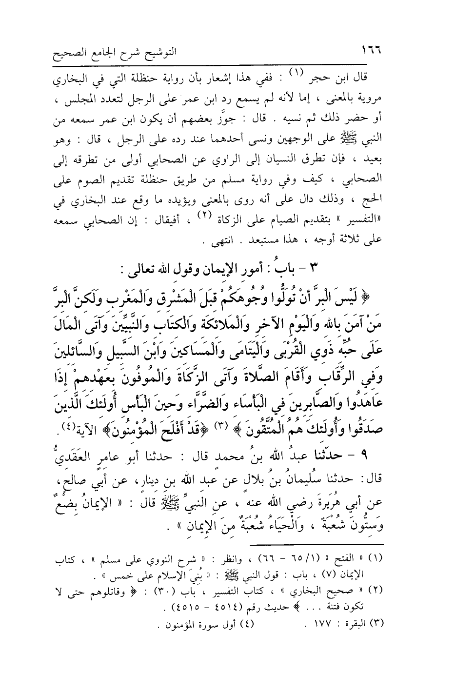 قال ابن حجر: ففي هذا إشعار بأن رواية حنظلة التي فى البخاري مروية بالمعنى، إما لأنه لم يسمع رد ابن عمر على الرجل لتعدد المجلس، أو حضر ذلك ثم نسيه. قال: جوَّز بعضهم أن يكون ابن عمر سمعه من النبي - صلى الله عليه وسلم - على الوجهين ونسى أحدهما عند رده على الرجل، قال: وهو بعيد، فإن تطرق النسيان إلى الراوي عن الصحابي أولى من تطرقه إلى الصحابي، كيف وفي رواية مسلم من طريق حنظلة تقديم الصوم على الحج، وذلك دال على أنه روى بالمعنى ويؤيده ما وقع عند البخاري في "التفسير" بتقديم الصيام على الزكاة، أفيقال: إن الصحابي سمعه على ثلاثة أوجه، هذا مستبعد. انتهى.