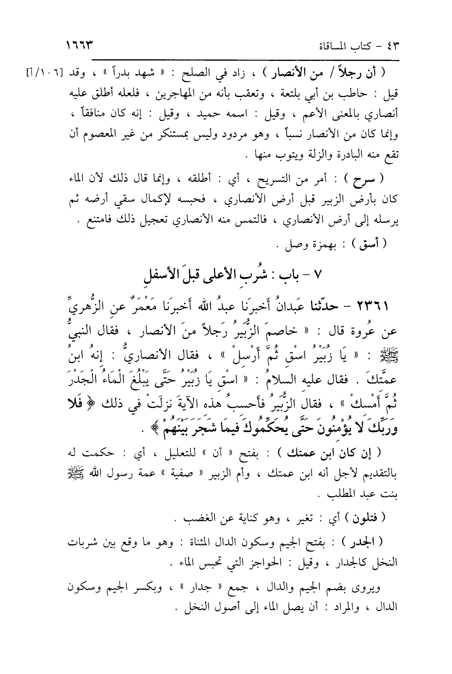 2361 - حَدَّثَنَا عَبْدَانُ، أَخْبَرَنَا عَبْدُ اللَّهِ، أَخْبَرَنَا مَعْمَرٌ، عَنِ الزُّهْرِيِّ، عَنْ عُرْوَةَ، قَالَ: خَاصَمَ الزُّبَيْرَ رَجُلٌ مِنَ الأَنْصَارِ، فَقَالَ النَّبِيُّ صَلَّى اللهُ عَلَيْهِ وَسَلَّمَ: «يَا زُبَيْرُ اسْقِ، ثُمَّ أَرْسِلْ»، فَقَالَ الأَنْصَارِيُّ: إِنَّهُ ابْنُ عَمَّتِكَ، فَقَالَ عَلَيْهِ السَّلاَمُ: «اسْقِ يَا زُبَيْرُ، ثُمَّ يَبْلُغُ المَاءُ الجَدْرَ، ثُمَّ أَمْسِكْ» فَقَالَ الزُّبَيْرُ: " فَأَحْسِبُ هَذِهِ الآيَةَ نَزَلَتْ فِي ذَلِكَ: {فَلاَ وَرَبِّكَ لاَ يُؤْمِنُونَ حَتَّى يُحَكِّمُوكَ فِيمَا شَجَرَ بَيْنَهُمْ} [النساء: 65] ".