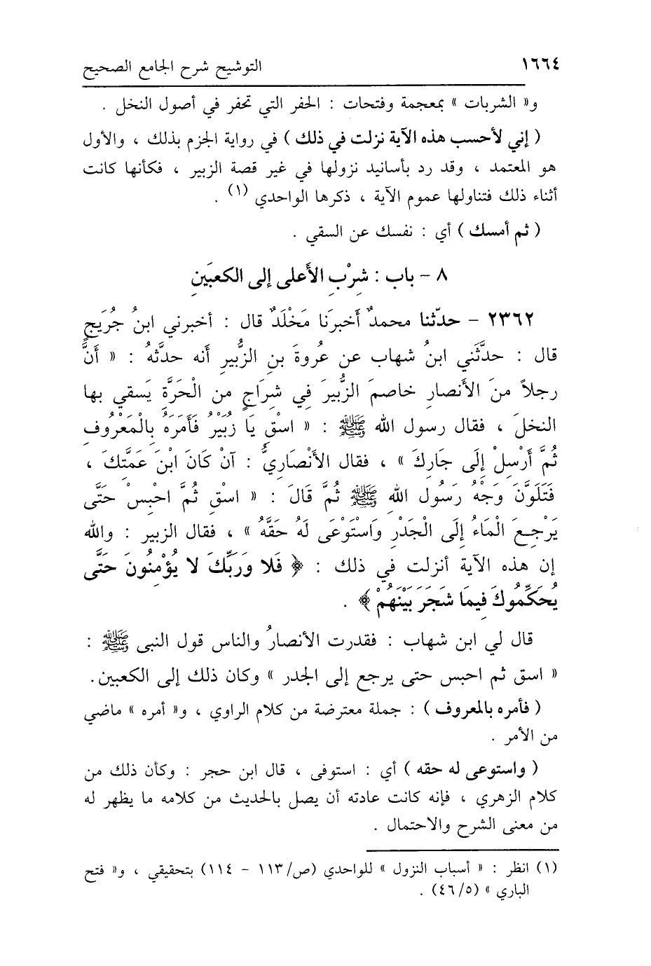 2362 - حَدَّثَنَا مُحَمَّدٌ هُوَ ابْنُ سَلاَمٍ، أَخْبَرَنَا مَخْلَدُ بْنُ يَزِيدَ الحَرَّانِيُّ، قَالَ: أَخْبَرَنِي ابْنُ جُرَيْجٍ، قَالَ: حَدَّثَنِي ابْنُ شِهَابٍ، عَنْ عُرْوَةَ بْنِ الزُّبَيْرِ، أَنَّهُ حَدَّثَهُ أَنَّ رَجُلًا مِنَ الأَنْصَارِ خَاصَمَ الزُّبَيْرَ فِي شِرَاجٍ مِنَ الحَرَّةِ يَسْقِي بِهَا النَّخْلَ، فَقَالَ رَسُولُ اللَّهِ صَلَّى اللهُ عَلَيْهِ وَسَلَّمَ: «اسْقِ يَا زُبَيْرُ، فَأَمَرَهُ بِالْمَعْرُوفِ، ثُمَّ أَرْسِلْ إِلَى جَارِكَ» فَقَالَ الأَنْصَارِيُّ: أَنْ كَانَ ابْنَ عَمَّتِكَ، فَتَلَوَّنَ وَجْهُ رَسُولِ اللَّهِ صَلَّى اللهُ عَلَيْهِ وَسَلَّمَ، ثُمَّ قَالَ: «اسْقِ، ثُمَّ احْبِسْ، يَرْجِعَ المَاءُ إِلَى الجَدْرِ، وَاسْتَوْعَى لَهُ حَقَّهُ» فَقَالَ الزُّبَيْرُ: " وَاللَّهِ إِنَّ هَذِهِ الآيَةَ أُنْزِلَتْ فِي ذَلِكَ: {فَلاَ وَرَبِّكَ لاَ يُؤْمِنُونَ حَتَّى يُحَكِّمُوكَ فِيمَا شَجَرَ بَيْنَهُمْ} [النساء: 65] " قَالَ لِي ابْنُ شِهَابٍ: فَقَدَّرَتِ الأَنْصَارُ وَالنَّاسُ قَوْلَ النَّبِيِّ صَلَّى اللهُ عَلَيْهِ وَسَلَّمَ: «اسْقِ، ثُمَّ احْبِسْ حَتَّى يَرْجِعَ إِلَى الجَدْرِ» وَكَانَ ذَلِكَ إِلَى الكَعْبَيْنِ.