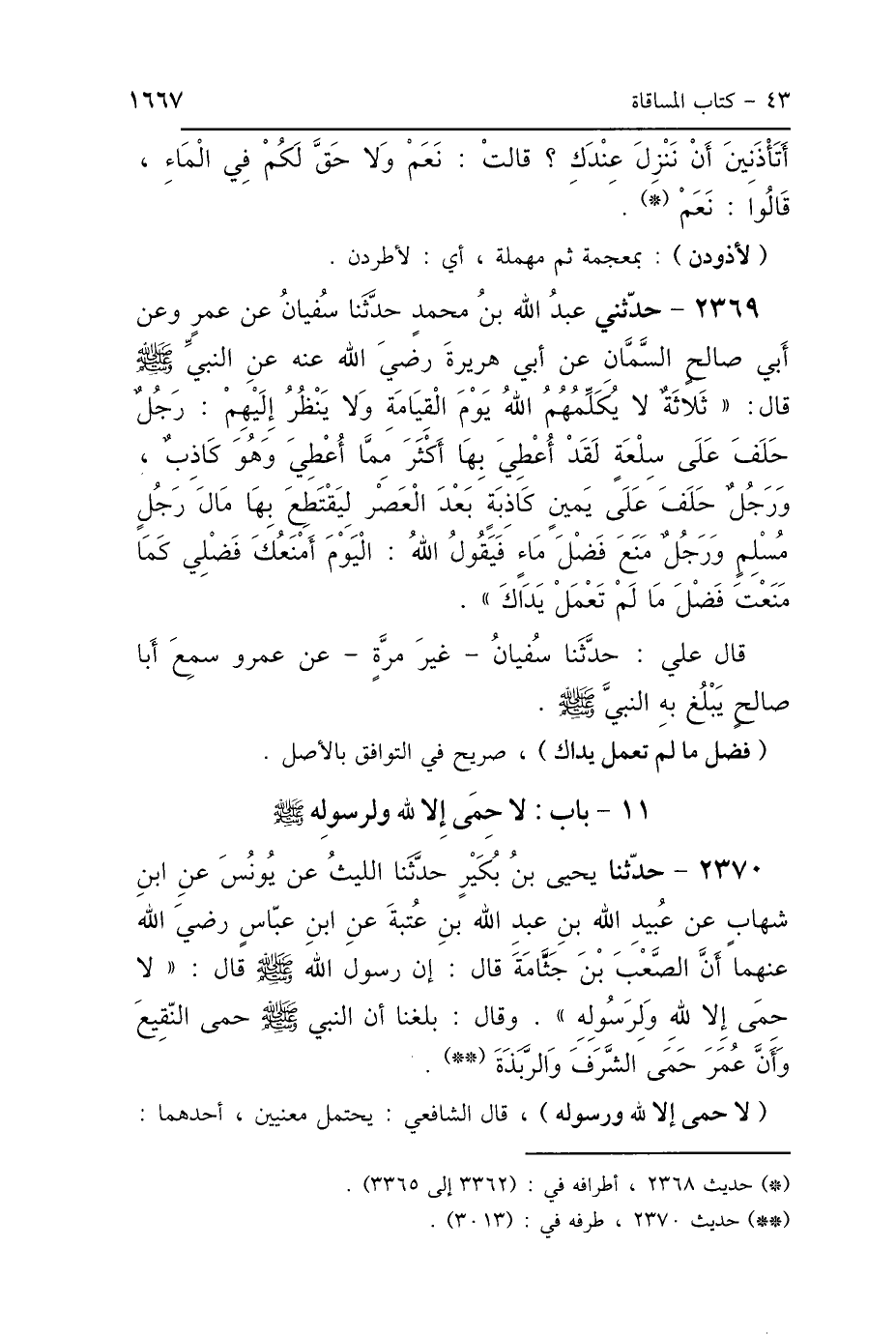 2369 - حَدَّثَنَا عَبْدُ اللَّهِ بْنُ مُحَمَّدٍ، حَدَّثَنَا سُفْيَانُ، عَنْ عَمْرٍو، عَنْ أَبِي صَالِحٍ السَّمَّانِ، عَنْ أَبِي هُرَيْرَةَ رَضِيَ اللَّهُ عَنْهُ، عَنِ النَّبِيِّ صَلَّى اللهُ عَلَيْهِ وَسَلَّمَ قَالَ: " ثَلاَثَةٌ لاَ يُكَلِّمُهُمُ اللَّهُ يَوْمَ القِيَامَةِ، وَلاَ يَنْظُرُ إِلَيْهِمْ: رَجُلٌ حَلَفَ عَلَى سِلْعَةٍ لَقَدْ أَعْطَى بِهَا أَكْثَرَ مِمَّا أَعْطَى وَهُوَ كَاذِبٌ، وَرَجُلٌ حَلَفَ عَلَى يَمِينٍ كَاذِبَةٍ بَعْدَ العَصْرِ، لِيَقْتَطِعَ بِهَا مَالَ رَجُلٍ مُسْلِمٍ، وَرَجُلٌ مَنَعَ فَضْلَ مَاءٍ فَيَقُولُ اللَّهُ: اليَوْمَ أَمْنَعُكَ فَضْلِي كَمَا مَنَعْتَ فَضْلَ مَا لَمْ تَعْمَلْ يَدَاكَ "، قَالَ عَلِيٌّ، حَدَّثَنَا سُفْيَانُ، غَيْرَ مَرَّةٍ، عَنْ عَمْرٍو، سَمِعَ أَبَا صَالِحٍ يَبْلُغُ بِهِ النَّبِيَّ صَلَّى اللهُ عَلَيْهِ وَسَلَّمَ.