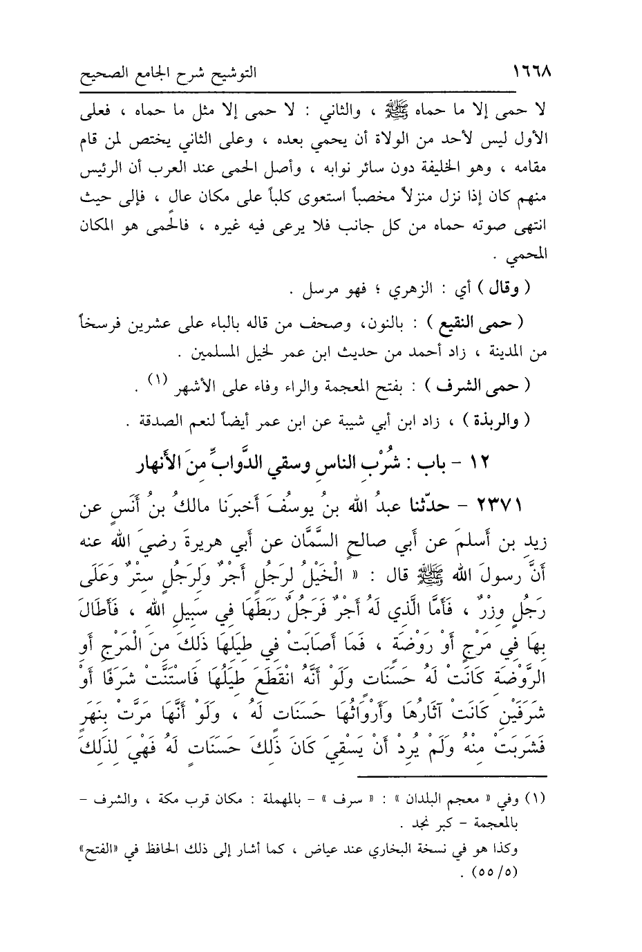 (حمى النقيع): بالنون، وصحف من قاله بالباء على عشرين فرسخًا من المدينة، زاد أحمد من حديث ابن عمر لخيل المسلمين.