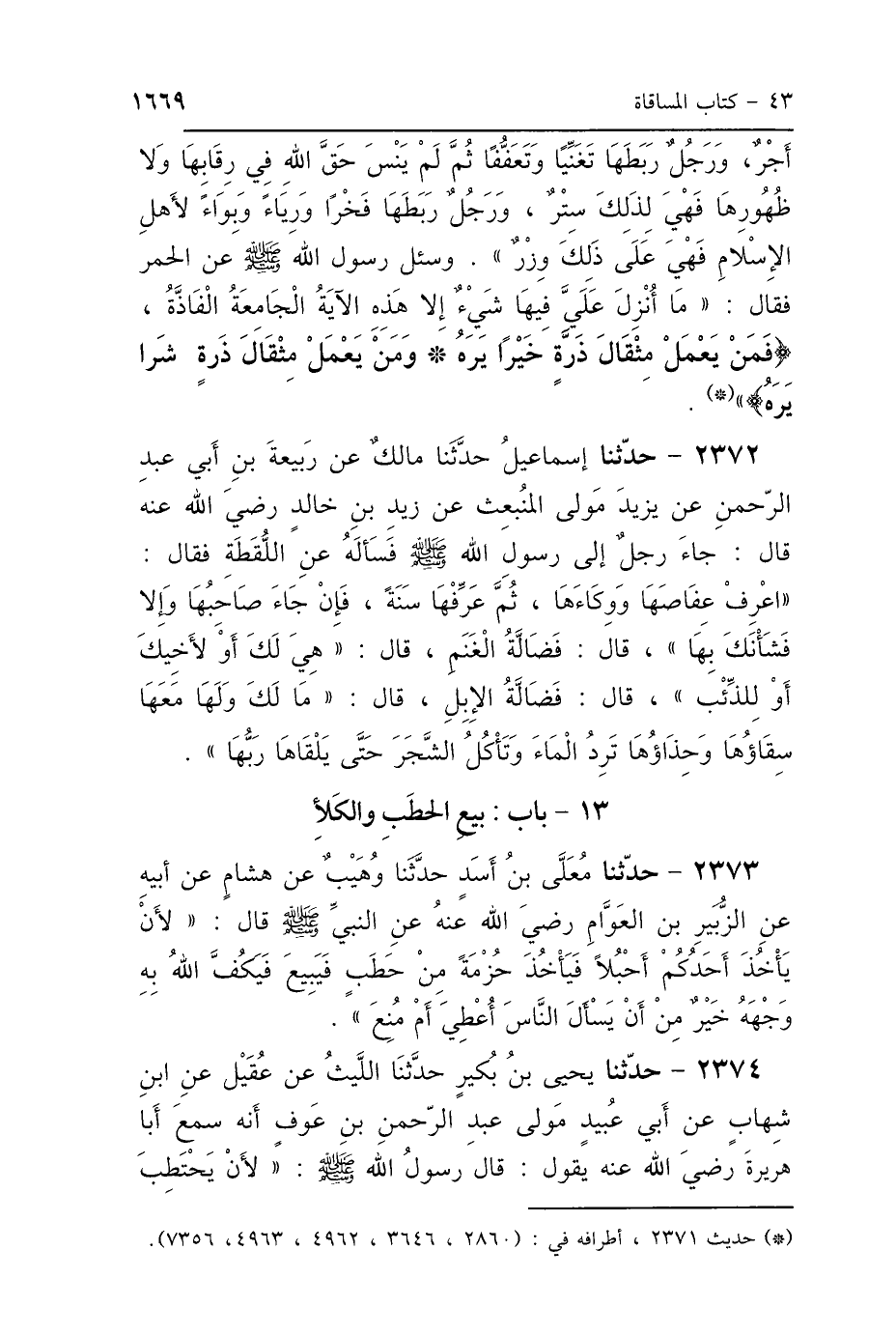2372 - حَدَّثَنَا إِسْمَاعِيلُ، حَدَّثَنَا مَالِكٌ، عَنْ رَبِيعَةَ بْنِ أَبِي عَبْدِ الرَّحْمَنِ، عَنْ يَزِيدَ مَوْلَى المُنْبَعِثِ، عَنْ زَيْدِ بْنِ خَالِدٍ الجُهَنِيِّ رَضِيَ اللَّهُ عَنْهُ قَالَ: جَاءَ رَجُلٌ إِلَى رَسُولِ اللَّهِ صَلَّى اللهُ عَلَيْهِ وَسَلَّمَ، فَسَأَلَهُ عَنْ اللُّقَطَةِ، فَقَالَ: «اعْرِفْ عِفَاصَهَا وَوِكَاءَهَا، ثُمَّ عَرِّفْهَا سَنَةً، فَإِنْ جَاءَ صَاحِبُهَا وَإِلَّا فَشَأْنَكَ بِهَا» قَالَ: فَضَالَّةُ الغَنَمِ؟ قَالَ: «هِيَ لَكَ أَوْ لِأَخِيكَ أَوْ لِلذِّئْبِ»، قَالَ: فَضَالَّةُ الإِبِلِ؟ قَالَ: «مَا لَكَ وَلَهَا، مَعَهَا سِقَاؤُهَا وَحِذَاؤُهَا، تَرِدُ المَاءَ وَتَأْكُلُ الشَّجَرَ حَتَّى يَلْقَاهَا رَبُّهَا».