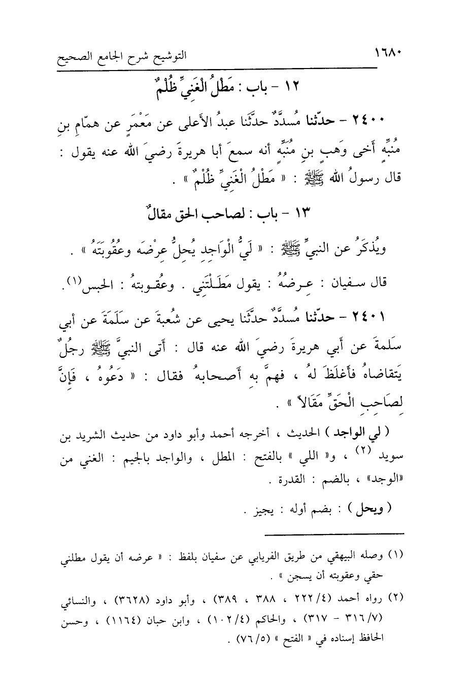 وَيُذْكَرُ عَنِ النَّبِيِّ صَلَّى اللهُ عَلَيْهِ وَسَلَّمَ: «لَيُّ الوَاجِدِ يُحِلُّ عُقُوبَتَهُ وَعِرْضَهُ» قَالَ سُفْيَانُ: " عِرْضُهُ يَقُولُ: مَطَلْتَنِي وَعُقُوبَتُهُ الحَبْسُ".