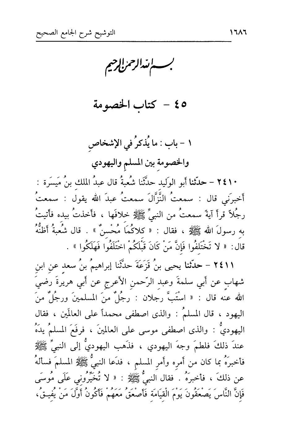 2411 - حَدَّثَنَا يَحْيَى بْنُ قَزَعَةَ، حَدَّثَنَا إِبْرَاهِيمُ بْنُ سَعْدٍ، عَنِ ابْنِ شِهَابٍ، عَنْ أَبِي سَلَمَةَ، وَعَبْدِ الرَّحْمَنِ الأَعْرَجِ، عَنْ أَبِي هُرَيْرَةَ رَضِيَ اللَّهُ عَنْهُ، قَالَ: اسْتَبَّ رَجُلاَنِ رَجُلٌ مِنَ المُسْلِمِينَ وَرَجُلٌ مِنَ اليَهُودِ، قَالَ المُسْلِمُ: وَالَّذِي اصْطَفَى مُحَمَّدًا عَلَى العَالَمِينَ، فَقَالَ اليَهُودِيُّ: وَالَّذِي اصْطَفَى مُوسَى عَلَى العَالَمِينَ، فَرَفَعَ المُسْلِمُ يَدَهُ عِنْدَ ذَلِكَ، فَلَطَمَ وَجْهَ اليَهُودِيِّ، فَذَهَبَ اليَهُودِيُّ إِلَى النَّبِيِّ صَلَّى اللهُ عَلَيْهِ وَسَلَّمَ، فَأَخْبَرَهُ بِمَا كَانَ مِنْ أَمْرِهِ، وَأَمْرِ المُسْلِمِ، فَدَعَا النَّبِيُّ صَلَّى اللهُ عَلَيْهِ وَسَلَّمَ المُسْلِمَ، فَسَأَلَهُ عَنْ ذَلِكَ، فَأَخْبَرَهُ، فَقَالَ النَّبِيُّ صَلَّى اللهُ عَلَيْهِ وَسَلَّمَ: «لاَ تُخَيِّرُونِي عَلَى مُوسَى، فَإِنَّ النَّاسَ يَصْعَقُونَ يَوْمَ القِيَامَةِ، فَأَصْعَقُ مَعَهُمْ، فَأَكُونُ أَوَّلَ مَنْ يُفِيقُ،