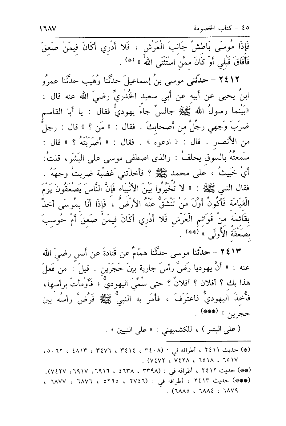2412 - حَدَّثَنَا مُوسَى بْنُ إِسْمَاعِيلَ، حَدَّثَنَا وُهَيْبٌ، حَدَّثَنَا عَمْرُو بْنُ يَحْيَى، عَنْ أَبِيهِ، عَنْ أَبِي سَعِيدٍ الخُدْرِيِّ رَضِيَ اللَّهُ عَنْهُ، قَالَ: بَيْنَمَا رَسُولُ اللَّهِ صَلَّى اللهُ عَلَيْهِ وَسَلَّمَ جَالِسٌ جَاءَ يَهُودِيٌّ، فَقَالَ: يَا أَبَا القَاسِمِ ضَرَبَ وَجْهِي رَجُلٌ مِنْ أَصْحَابِكَ، فَقَالَ: مَنْ؟ "، قَالَ: رَجُلٌ مِنَ الأَنْصَارِ، قَالَ: «ادْعُوهُ»، فَقَالَ: «أَضَرَبْتَهُ؟»، قَالَ: سَمِعْتُهُ بِالسُّوقِ يَحْلِفُ: وَالَّذِي اصْطَفَى مُوسَى عَلَى البَشَرِ، قُلْتُ: أَيْ خَبِيثُ، عَلَى مُحَمَّدٍ صَلَّى اللهُ عَلَيْهِ وَسَلَّمَ، فَأَخَذَتْنِي غَضْبَةٌ ضَرَبْتُ وَجْهَهُ، فَقَالَ النَّبِيُّ صَلَّى اللهُ عَلَيْهِ وَسَلَّمَ: «لاَ تُخَيِّرُوا بَيْنَ الأَنْبِيَاءِ، فَإِنَّ النَّاسَ يَصْعَقُونَ يَوْمَ القِيَامَةِ، فَأَكُونُ أَوَّلَ مَنْ تَنْشَقُّ عَنْهُ الأَرْضُ، فَإِذَا أَنَا بِمُوسَى آخِذٌ بِقَائِمَةٍ مِنْ قَوَائِمِ العَرْشِ، فَلاَ أَدْرِي أَكَانَ فِيمَنْ صَعِقَ، أَمْ حُوسِبَ بِصَعْقَةِ الأُولَى».
