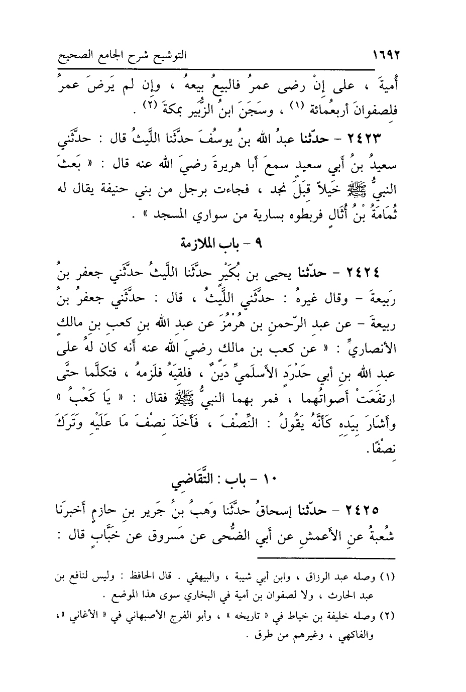 2424 - حَدَّثَنَا يَحْيَى بْنُ بُكَيْرٍ، حَدَّثَنَا اللَّيْثُ، حَدَّثَنِي جَعْفَرُ بْنُ رَبِيعَةَ - وَقَالَ غَيْرُهُ: حَدَّثَنِي اللَّيْثُ - قَالَ: حَدَّثَنِي جَعْفَرُ بْنُ رَبِيعَةَ، عَنْ عَبْدِ الرَّحْمَنِ بْنِ هُرْمُزَ، عَنْ عَبْدِ اللَّهِ بْنِ كَعْبِ بْنِ مَالِكٍ الأَنْصَارِيِّ، عَنْ كَعْبِ بْنِ مَالِكٍ رَضِيَ اللَّهُ عَنْهُ، أَنَّهُ كَانَ لَهُ عَلَى عَبْدِ اللَّهِ بْنِ أَبِي حَدْرَدٍ الأَسْلَمِيِّ دَيْنٌ، فَلَقِيَهُ، فَلَزِمَهُ فَتَكَلَّمَا حَتَّى ارْتَفَعَتْ أَصْوَاتُهُمَا، فَمَرَّ بِهِمَا النَّبِيُّ صَلَّى اللهُ عَلَيْهِ وَسَلَّمَ فَقَالَ: «يَا كَعْبُ» وَأَشَارَ بِيَدِهِ، كَأَنَّهُ يَقُولُ: النِّصْفَ، فَأَخَذَ نِصْفَ مَا عَلَيْهِ وَتَرَكَ نِصْفًا.