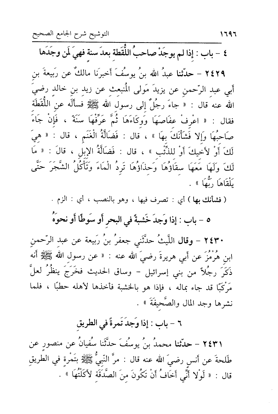 2429 - حَدَّثَنَا عَبْدُ اللَّهِ بْنُ يُوسُفَ، أَخْبَرَنَا مَالِكٌ، عَنْ رَبِيعَةَ بْنِ أَبِي عَبْدِ الرَّحْمَنِ، عَنْ يَزِيدَ مَوْلَى المُنْبَعِثِ، عَنْ زَيْدِ بْنِ خَالِدٍ رَضِيَ اللَّهُ عَنْهُ، قَالَ: جَاءَ رَجُلٌ إِلَى رَسُولِ اللَّهِ صَلَّى اللهُ عَلَيْهِ وَسَلَّمَ، فَسَأَلَهُ عَنْ اللُّقَطَةِ، فَقَالَ: «اعْرِفْ عِفَاصَهَا وَوِكَاءَهَا، ثُمَّ عَرِّفْهَا سَنَةً، فَإِنْ جَاءَ صَاحِبُهَا وَإِلَّا فَشَأْنَكَ بِهَا»، قَالَ: فَضَالَّةُ الغَنَمِ؟ قَالَ: «هِيَ لَكَ أَوْ لِأَخِيكَ أَوْ لِلذِّئْبِ»، قَالَ: فَضَالَّةُ الإِبِلِ؟ قَالَ: «مَا لَكَ وَلَهَا، مَعَهَا سِقَاؤُهَا، وَحِذَاؤُهَا تَرِدُ المَاءَ، وَتَأْكُلُ الشَّجَرَ حَتَّى يَلْقَاهَا رَبُّهَا».