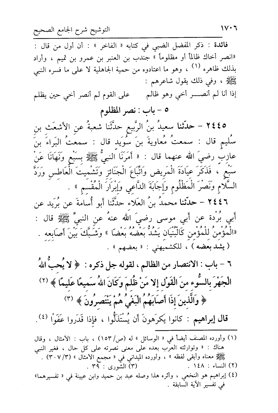 6 - بَابُ الِانْتِصَارِ مِنَ الظَّالِمِ، لِقَوْلِهِ جَلَّ ذِكْرُهُ: {لاَ يُحِبُّ اللَّهُ الجَهْرَ بِالسُّوءِ مِنَ القَوْلِ إِلَّا مَنْ ظُلِمَ، وَكَانَ اللَّهُ سَمِيعًا عَلِيمًا} [النساء: 148] {وَالَّذِينَ إِذَا أَصَابَهُمُ البَغْيُ هُمْ يَنْتَصِرُونَ} [الشورى: 39]