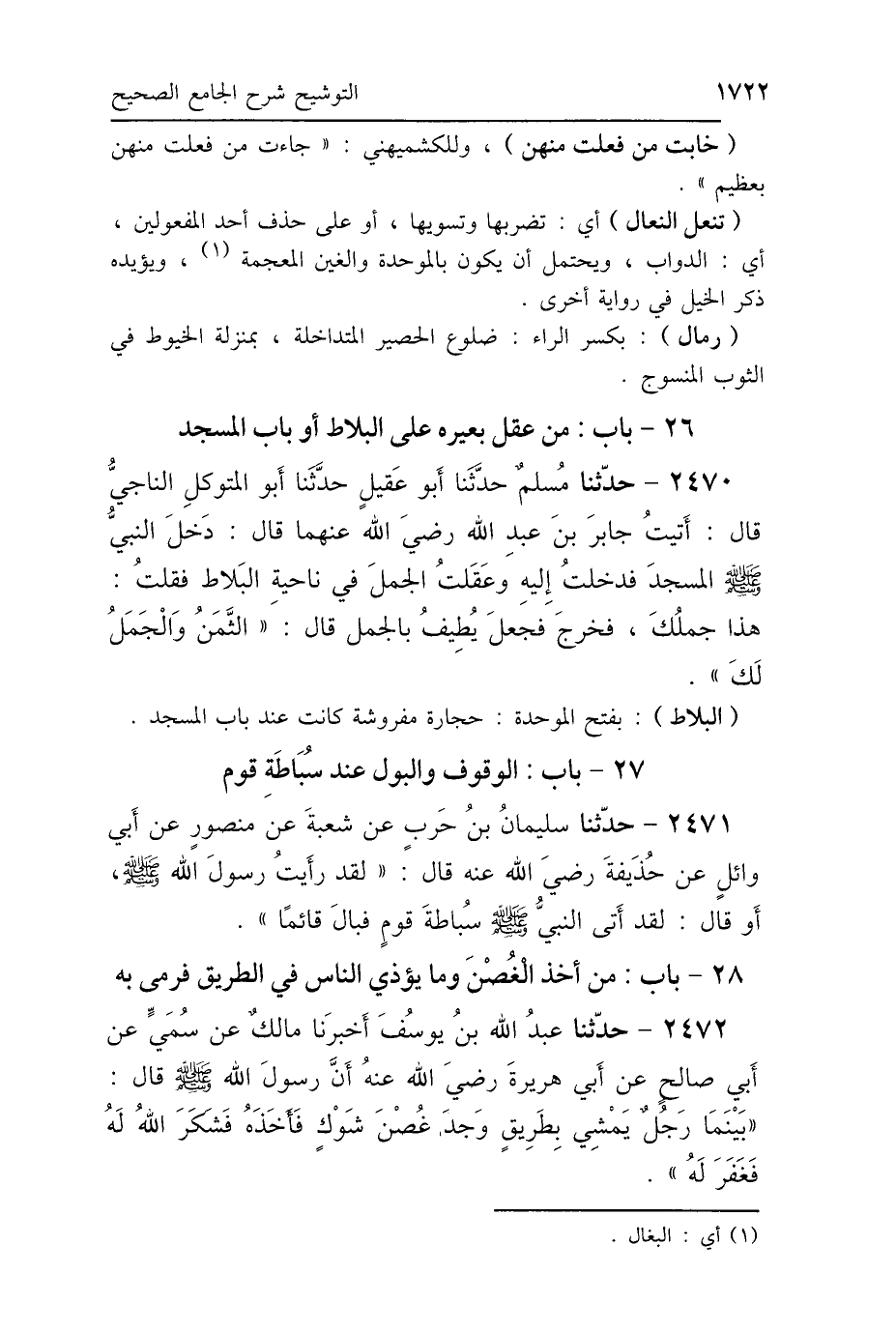 26 - بَابُ مَنْ عَقَلَ بَعِيرَهُ عَلَى البَلاَطِ أَوْ بَابِ المَسْجِدِ