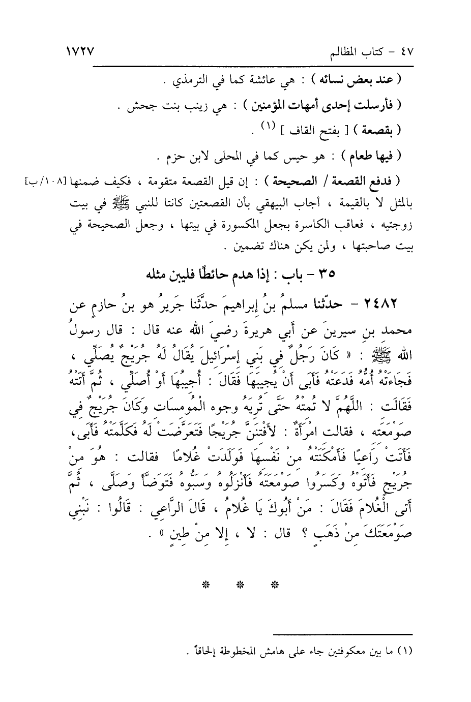 (فدفع القصعة الصحيحة): إن قيل القصعة متقومة، فكيف ضمنها بالمثل لا بالقيمة، أجاب البيهقي بأن القصعتين كانتا للنبي - صلى الله عليه وسلم - في بيت زوجتيه، فعاقب الكاسرة بجعل المكسورة في بيتها، وجعل الصحيحة في بيت صاحبتها، ولن يكن هناك تضمين.