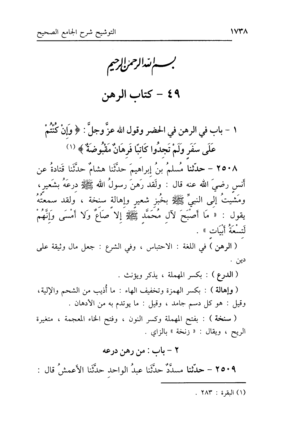 (الرهن) في اللغة: الاحتباس، وفي الشرع: جعل مال وثيقة على دين.