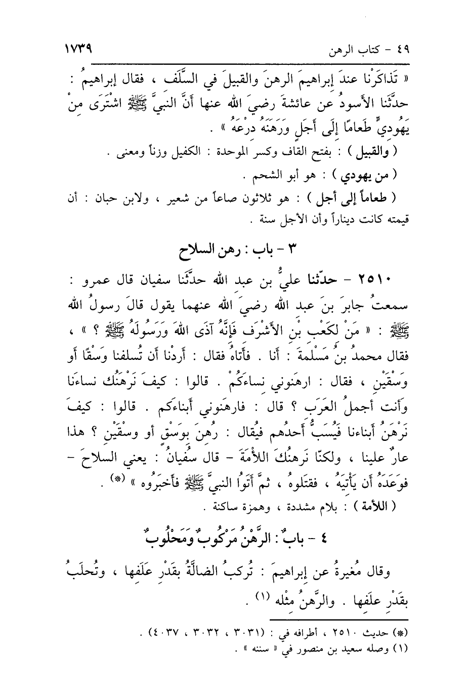 تَذَاكَرْنَا عِنْدَ إِبْرَاهِيمَ الرَّهْنَ وَالقَبِيلَ فِي السَّلَفِ، فَقَالَ إِبْرَاهِيمُ، حَدَّثَنَا الأَسْوَدُ، عَنْ عَائِشَةَ رَضِيَ اللَّهُ عَنْهَا: أَنَّ النَّبِيَّ صَلَّى اللهُ عَلَيْهِ وَسَلَّمَ «اشْتَرَى مِنْ يَهُودِيٍّ طَعَامًا إِلَى أَجَلٍ، وَرَهَنَهُ دِرْعَهُ».