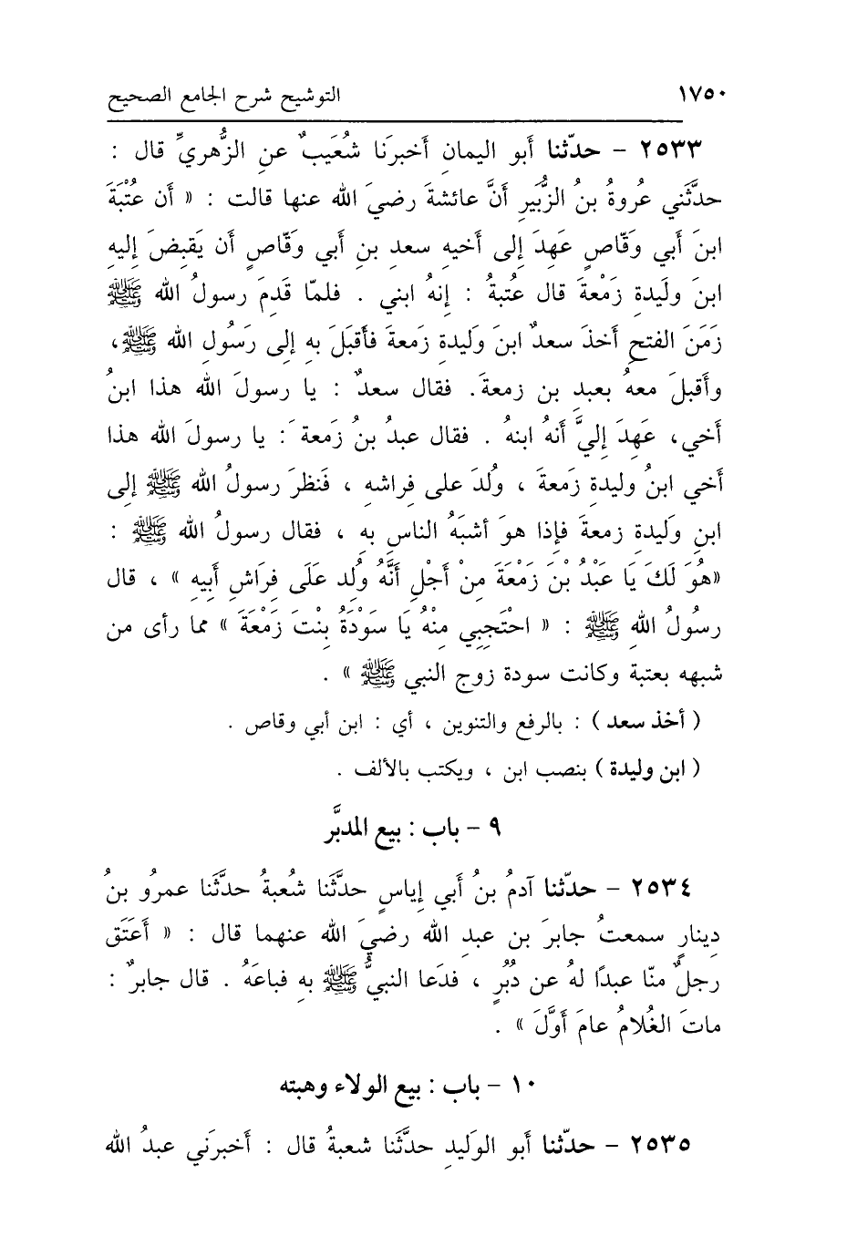 2533 - حَدَّثَنَا أَبُو اليَمَانِ، أَخْبَرَنَا شُعَيْبٌ، عَنِ الزُّهْرِيِّ، قَالَ: حَدَّثَنِي عُرْوَةُ بْنُ الزُّبَيْرِ، أَنَّ عَائِشَةَ رَضِيَ اللَّهُ عَنْهَا، قَالَتْ: إِنَّ عُتْبَةَ بْنَ أَبِي وَقَّاصٍ عَهِدَ إِلَى أَخِيهِ سَعْدِ بْنِ أَبِي وَقَّاصٍ أَنْ يَقْبِضَ إِلَيْهِ ابْنَ وَلِيدَةِ زَمْعَةَ، قَالَ عُتْبَةُ: إِنَّهُ ابْنِي، فَلَمَّا قَدِمَ رَسُولُ اللَّهِ صَلَّى اللهُ عَلَيْهِ وَسَلَّمَ زَمَنَ الفَتْحِ، أَخَذَ سَعْدٌ ابْنَ وَلِيدَةِ زَمْعَةَ، فَأَقْبَلَ بِهِ إِلَى رَسُولِ اللَّهِ صَلَّى اللهُ عَلَيْهِ وَسَلَّمَ، وَأَقْبَلَ مَعَهُ بِعَبْدِ بْنِ زَمْعَةَ، فَقَالَ سَعْدٌ: يَا رَسُولَ اللَّهِ هَذَا ابْنُ أَخِي عَهِدَ إِلَيَّ أَنَّهُ ابْنُهُ، فَقَالَ عَبْدُ بْنُ زَمْعَةَ: يَا رَسُولَ اللَّهِ هَذَا أَخِي ابْنُ وَلِيدَةِ زَمْعَةَ، وُلِدَ عَلَى فِرَاشِهِ، فَنَظَرَ رَسُولُ اللَّهِ صَلَّى اللهُ عَلَيْهِ وَسَلَّمَ إِلَى ابْنِ وَلِيدَةِ زَمْعَةَ، فَإِذَا هُوَ أَشْبَهُ النَّاسِ بِهِ، فَقَالَ رَسُولُ اللَّهِ صَلَّى اللهُ عَلَيْهِ وَسَلَّمَ: «هُوَ لَكَ يَا عَبْدُ بْنَ زَمْعَةَ، مِنْ أَجْلِ أَنَّهُ وُلِدَ عَلَى فِرَاشِ أَبِيهِ» قَالَ رَسُولُ اللَّهِ صَلَّى اللهُ عَلَيْهِ وَسَلَّمَ: «احْتَجِبِي مِنْهُ يَا سَوْدَةُ بِنْتَ زَمْعَةَ» مِمَّا رَأَى مِنْ شَبَهِهِ بِعُتْبَةَ، وَكَانَتْ سَوْدَةُ زَوْجَ النَّبِيِّ صَلَّى اللهُ عَلَيْهِ وَسَلَّمَ.