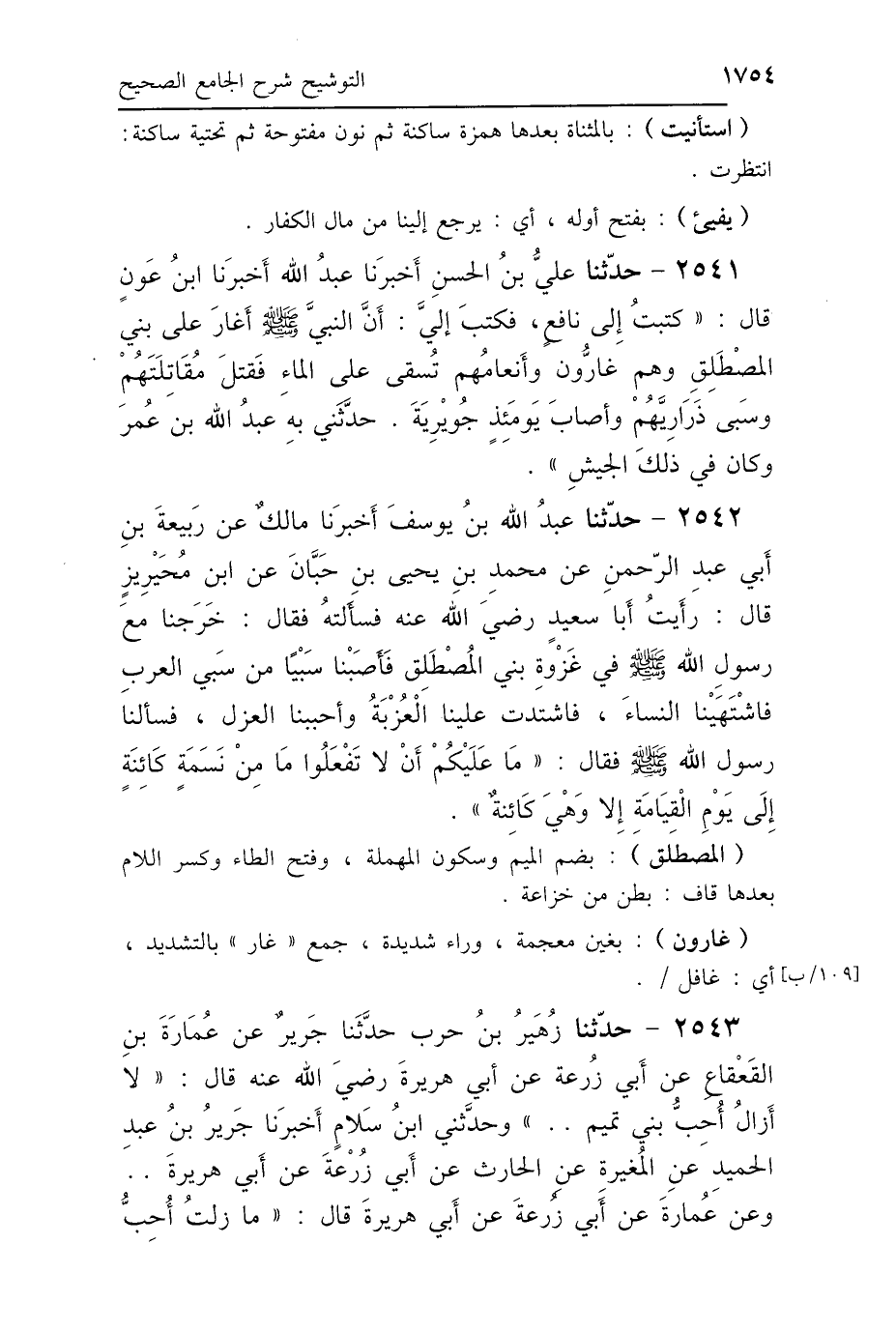 2542 - حَدَّثَنَا عَبْدُ اللَّهِ بْنُ يُوسُفَ، أَخْبَرَنَا مَالِكٌ، عَنْ رَبِيعَةَ بْنِ أَبِي عَبْدِ الرَّحْمَنِ، عَنْ مُحَمَّدِ بْنِ يَحْيَى بْنِ حَبَّانَ، عَنِ ابْنِ مُحَيْرِيزٍ، قَالَ: رَأَيْتُ أَبَا سَعِيدٍ رَضِيَ اللَّهُ عَنْهُ، فَسَأَلْتُهُ، فَقَالَ: خَرَجْنَا مَعَ رَسُولِ اللَّهِ صَلَّى اللهُ عَلَيْهِ وَسَلَّمَ فِي غَزْوَةِ بَنِي المُصْطَلِقِ، فَأَصَبْنَا سَبْيًا مِنْ سَبْيِ العَرَبِ، فَاشْتَهَيْنَا النِّسَاءَ، فَاشْتَدَّتْ عَلَيْنَا العُزْبَةُ، وَأَحْبَبْنَا العَزْلَ، فَسَأَلْنَا رَسُولَ اللَّهِ صَلَّى اللهُ عَلَيْهِ وَسَلَّمَ، فَقَالَ: «مَا عَلَيْكُمْ أَنْ لاَ تَفْعَلُوا مَا مِنْ نَسَمَةٍ كَائِنَةٍ إِلَى يَوْمِ القِيَامَةِ إِلَّا وَهِيَ كَائِنَةٌ».