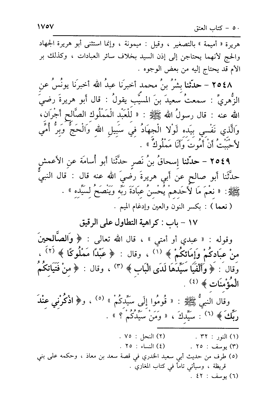 2548 - حَدَّثَنَا بِشْرُ بْنُ مُحَمَّدٍ، أَخْبَرَنَا عَبْدُ اللَّهِ، أَخْبَرَنَا يُونُسُ، عَنِ الزُّهْرِيِّ، سَمِعْتُ سَعِيدَ بْنَ المُسَيِّبِ، يَقُولُ: قَالَ أَبُو هُرَيْرَةَ رَضِيَ اللَّهُ عَنْهُ: قَالَ رَسُولُ اللَّهِ صَلَّى اللهُ عَلَيْهِ وَسَلَّمَ: «لِلْعَبْدِ المَمْلُوكِ الصَّالِحِ أَجْرَانِ، وَالَّذِي نَفْسِي بِيَدِهِ لَوْلاَ الجِهَادُ فِي سَبِيلِ اللَّهِ، وَالحَجُّ وَبِرُّ أُمِّي، لَأَحْبَبْتُ أَنْ أَمُوتَ وَأَنَا مَمْلُوكٌ».