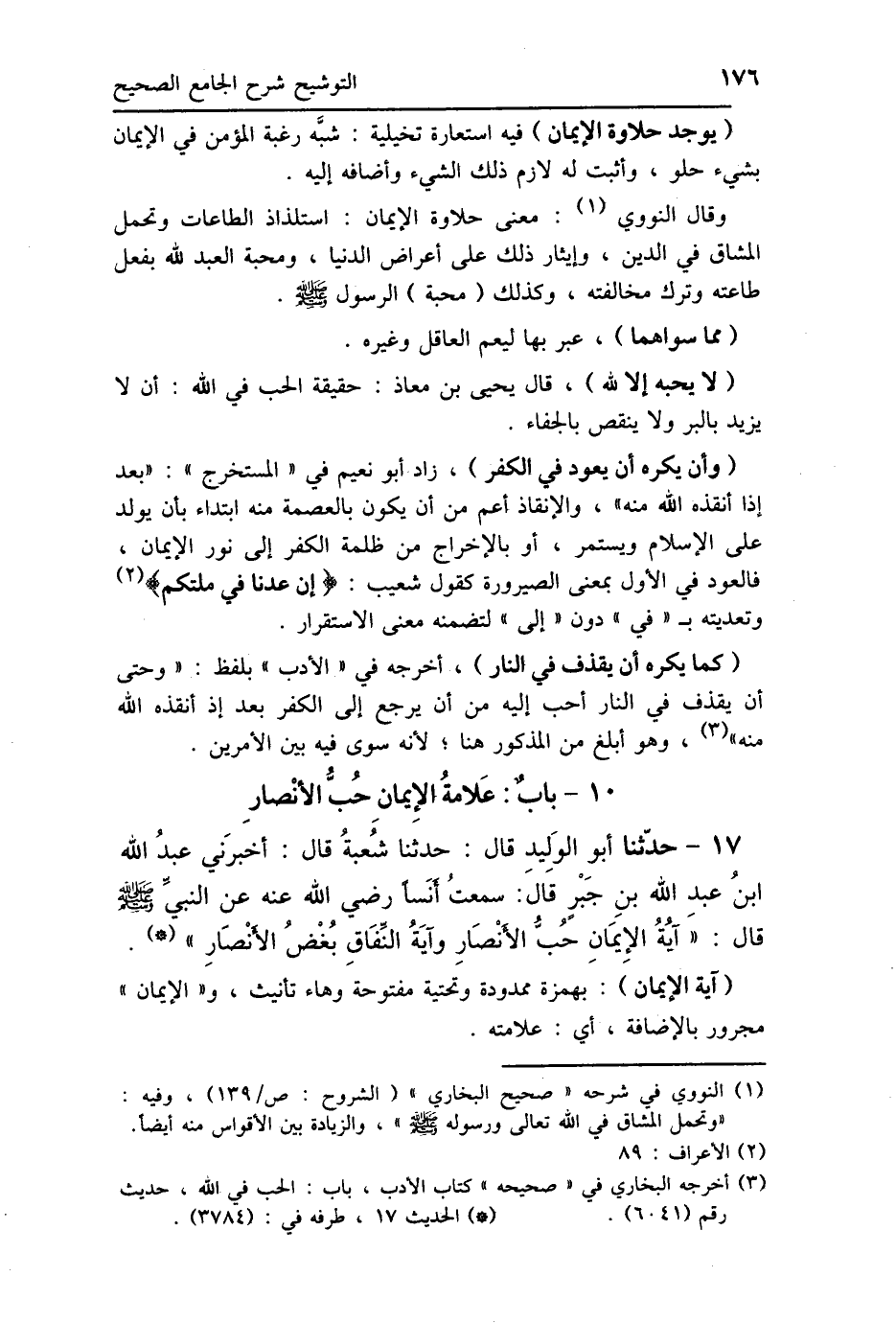 وقال النووي: معنى حلاوة الإيمان: استلذاذ الطاعات وتحمل المشاق في الدين، وإيثار ذلك على أعراض الدنيا، ومحبة العبد لله بفعل طاعته وترك مخالفته، وكذلك (محبة) الرسول - صلى الله عليه وسلم -.