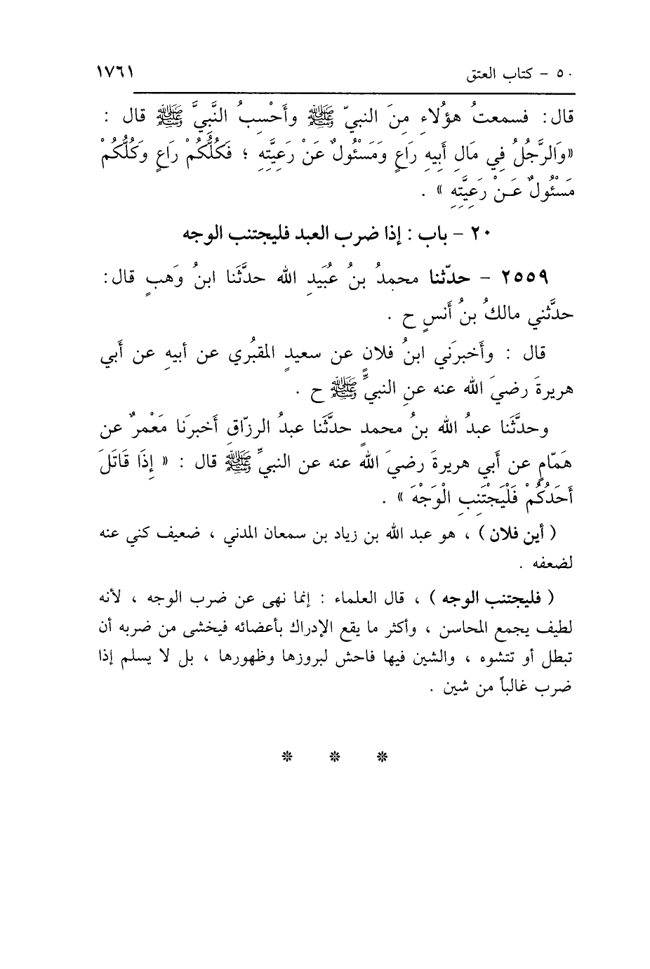 2559 - حَدَّثَنَا مُحَمَّدُ بْنُ عُبَيْدِ اللَّهِ، حَدَّثَنَا ابْنُ وَهْبٍ، قَالَ: حَدَّثَنِي مَالِكُ بْنُ أَنَسٍ، قَالَ: وَأَخْبَرَنِي ابْنُ فُلاَنٍ، عَنْ سَعِيدٍ المَقْبُرِيِّ، عَنْ أَبِيهِ، عَنْ أَبِي هُرَيْرَةَ رَضِيَ اللَّهُ عَنْهُ، عَنِ النَّبِيِّ صَلَّى اللهُ عَلَيْهِ وَسَلَّمَ، ح وَحَدَّثَنَا عَبْدُ اللَّهِ بْنُ مُحَمَّدٍ، حَدَّثَنَا عَبْدُ الرَّزَّاقِ، أَخْبَرَنَا مَعْمَرٌ، عَنْ هَمَّامٍ، عَنْ أَبِي هُرَيْرَةَ رَضِيَ اللَّهُ عَنْهُ، عَنِ النَّبِيِّ صَلَّى اللهُ عَلَيْهِ وَسَلَّمَ قَالَ: «إِذَا قَاتَلَ أَحَدُكُمْ فَلْيَجْتَنِبِ الوَجْهَ».