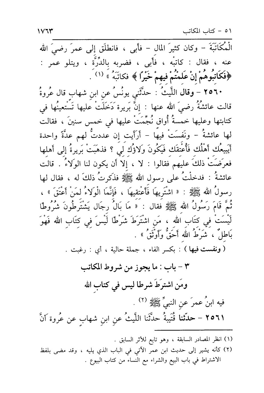 2560 - وَقَالَ اللَّيْثُ: حَدَّثَنِي يُونُسُ، عَنْ ابْنِ شِهَابٍ، قَالَ عُرْوَةُ: قَالَتْ عَائِشَةُ رَضِيَ اللَّهُ عَنْهَا: إِنَّ بَرِيرَةَ دَخَلَتْ عَلَيْهَا تَسْتَعِينُهَا فِي كِتَابَتِهَا، وَعَلَيْهَا خَمْسَةُ أَوَاقٍ نُجِّمَتْ عَلَيْهَا فِي خَمْسِ سِنِينَ، فَقَالَتْ لَهَا عَائِشَةُ وَنَفِسَتْ فِيهَا: أَرَأَيْتِ إِنْ عَدَدْتُ لَهُمْ عَدَّةً وَاحِدَةً أَيَبِيعُكِ أَهْلُكِ، فَأُعْتِقَكِ، فَيَكُونَ وَلاَؤُكِ لِي، فَذَهَبَتْ بَرِيرَةُ إِلَى أَهْلِهَا، فَعَرَضَتْ ذَلِكَ عَلَيْهِمْ، فَقَالُوا: لاَ، إِلَّا أَنْ يَكُونَ لَنَا الوَلاَءُ، قَالَتْ عَائِشَةُ: فَدَخَلْتُ عَلَى رَسُولِ اللَّهِ صَلَّى اللهُ عَلَيْهِ وَسَلَّمَ، فَذَكَرْتُ ذَلِكَ لَهُ، فَقَالَ لَهَا رَسُولُ اللَّهِ صَلَّى اللهُ عَلَيْهِ وَسَلَّمَ: «اشْتَرِيهَا، فَأَعْتِقِيهَا، فَإِنَّمَا الوَلاَءُ لِمَنْ أَعْتَقَ»، ثُمَّ قَامَ رَسُولُ اللَّهِ صَلَّى اللهُ عَلَيْهِ وَسَلَّمَ، فَقَالَ: «مَا بَالُ رِجَالٍ يَشْتَرِطُونَ شُرُوطًا لَيْسَتْ فِي كِتَابِ اللَّهِ، مَنِ اشْتَرَطَ شَرْطًا لَيْسَ فِي كِتَابِ اللَّهِ، فَهُوَ بَاطِلٌ شَرْطُ اللَّهِ أَحَقُّ وَأَوْثَقُ».