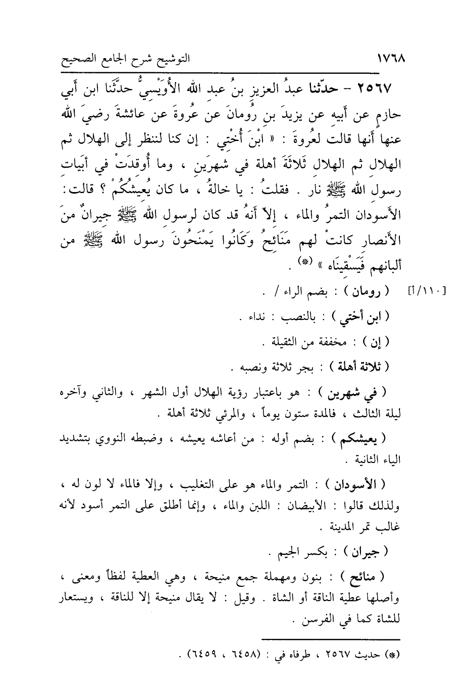 2567 - حَدَّثَنَا عَبْدُ العَزِيزِ بْنُ عَبْدِ اللَّهِ الأُوَيْسِيُّ، حَدَّثَنَا ابْنُ أَبِي حَازِمٍ، عَنْ أَبِيهِ، عَنْ يَزِيدَ بْنِ رُومَانَ، عَنْ عُرْوَةَ، عَنْ عَائِشَةَ رَضِيَ اللَّهُ عَنْهَا، أَنَّهَا قَالَتْ لِعُرْوَةَ: ابْنَ أُخْتِي «إِنْ كُنَّا لَنَنْظُرُ إِلَى الهِلاَلِ، ثُمَّ الهِلاَلِ، ثَلاَثَةَ أَهِلَّةٍ فِي شَهْرَيْنِ، وَمَا أُوقِدَتْ فِي أَبْيَاتِ رَسُولِ اللَّهِ صَلَّى اللهُ عَلَيْهِ وَسَلَّمَ نَارٌ»، فَقُلْتُ يَا خَالَةُ: مَا كَانَ يُعِيشُكُمْ؟ قَالَتْ: " الأَسْوَدَانِ: التَّمْرُ وَالمَاءُ، إِلَّا أَنَّهُ قَدْ كَانَ لِرَسُولِ اللَّهِ صَلَّى اللهُ عَلَيْهِ وَسَلَّمَ جِيرَانٌ مِنَ الأَنْصَارِ، كَانَتْ لَهُمْ مَنَائِحُ، وَكَانُوا يَمْنَحُونَ رَسُولَ اللَّهِ صَلَّى اللهُ عَلَيْهِ وَسَلَّمَ مِنْ أَلْبَانِهِمْ، فَيَسْقِينَا".