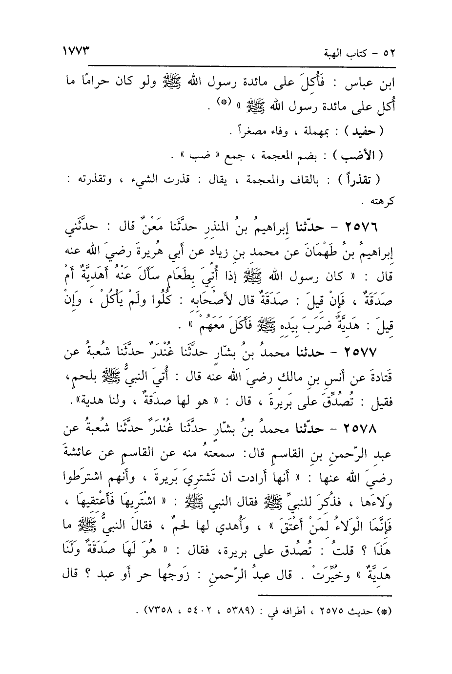 2577 - حَدَّثَنَا مُحَمَّدُ بْنُ بَشَّارٍ، حَدَّثَنَا غُنْدَرٌ، حَدَّثَنَا شُعْبَةُ، عَنْ قَتَادَةَ، عَنْ أَنَسِ بْنِ مَالِكٍ رَضِيَ اللَّهُ عَنْهُ، قَالَ: أُتِيَ النَّبِيُّ صَلَّى اللهُ عَلَيْهِ وَسَلَّمَ بِلَحْمٍ، فَقِيلَ: تُصُدِّقَ عَلَى بَرِيرَةَ، قَالَ: «هُوَ لَهَا صَدَقَةٌ وَلَنَا هَدِيَّةٌ».