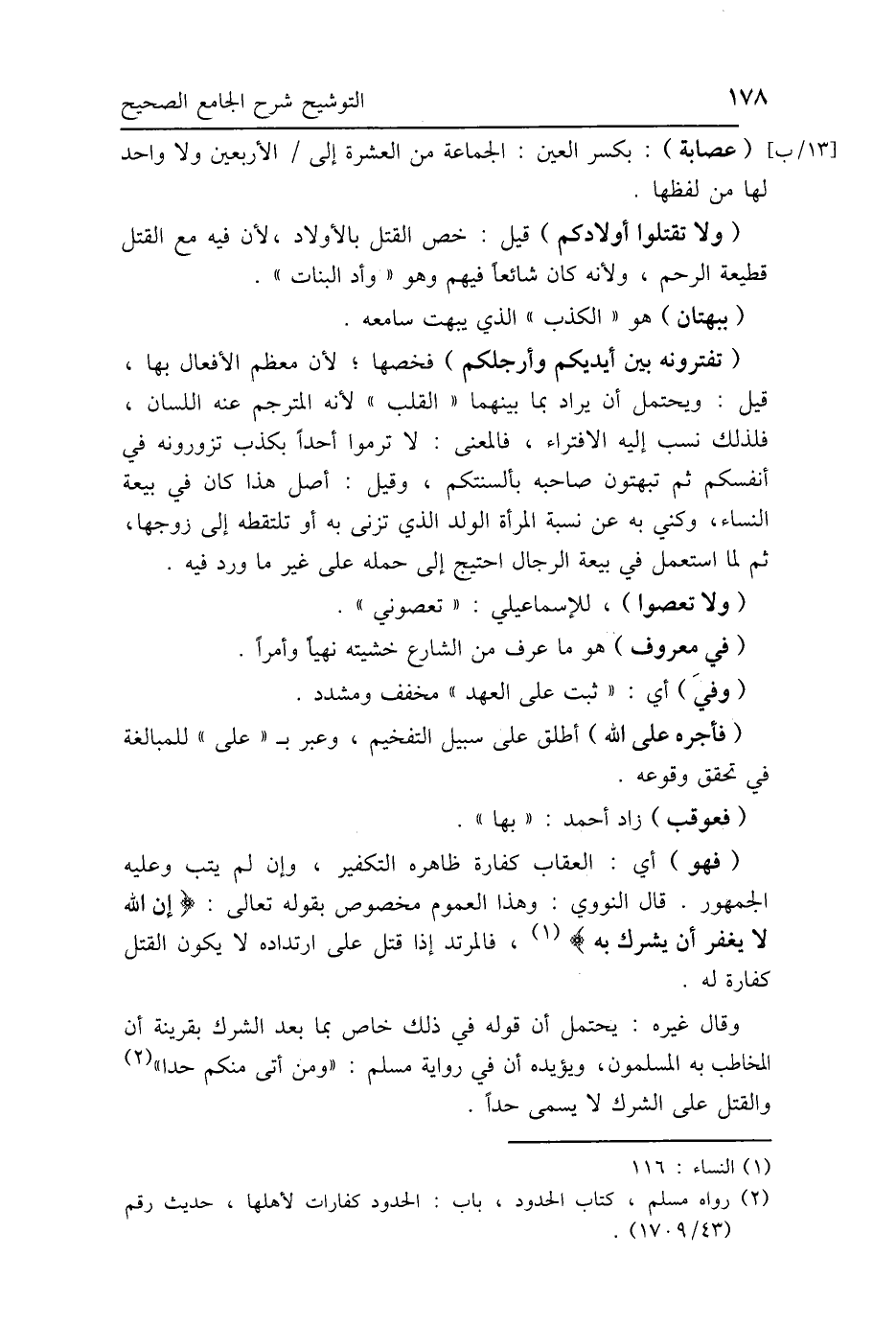 وقال غيره: يحتمل أن قوله في ذلك خاص بما بعد الشرك بقرينة أن المخاطب به المسلمون، ويؤيده أن في رواية مسلم: "ومن أتى منكم حدا" والقتل على الشرك لا يسمى حدًا.