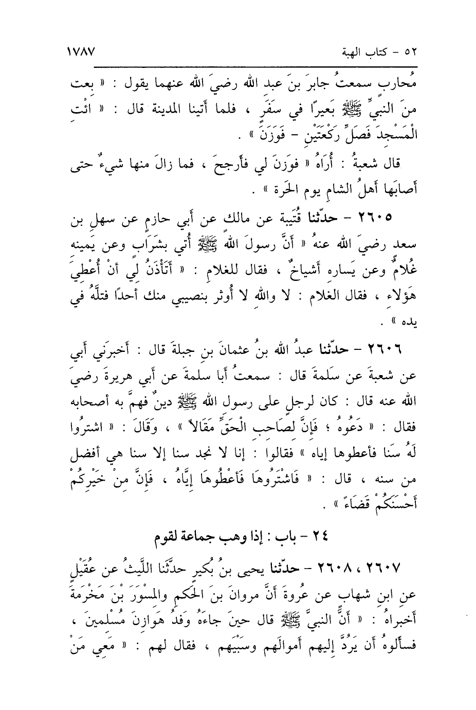 2607 - حَدَّثَنَا يَحْيَى بْنُ بُكَيْرٍ، حَدَّثَنَا اللَّيْثُ، عَنْ عُقَيْلٍ، عَنِ ابْنِ شِهَابٍ، عَنْ عُرْوَةَ، أَنَّ مَرْوَانَ بْنَ الحَكَمِ، وَالمِسْوَرَ بْنَ مَخْرَمَةَ، أَخْبَرَاهُ أَنَّ النَّبِيَّ صَلَّى اللهُ عَلَيْهِ وَسَلَّمَ قَالَ حِينَ جَاءَهُ وَفْدُ هَوَازِنَ مُسْلِمِينَ، فَسَأَلُوهُ أَنْ يَرُدَّ إِلَيْهِمْ أَمْوَالَهُمْ وَسَبْيَهُمْ، فَقَالَ لَهُمْ: "مَعِي مَنْ