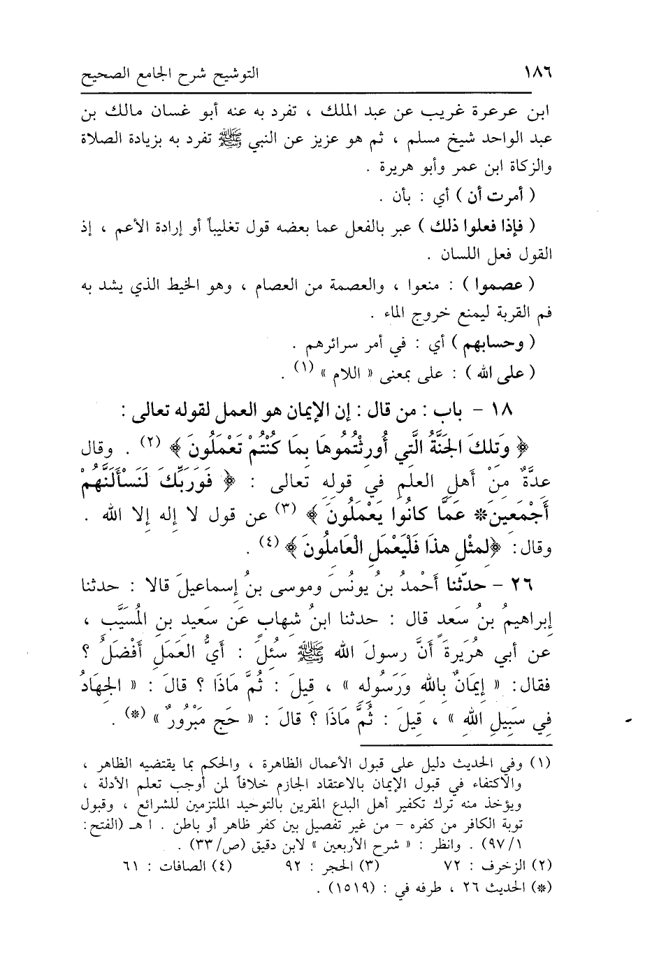 ابن عرعرة غريب عن عبد الملك، تفرد به عنه أبو غسان مالك بن عبد الواحد شيخ مسلم، ثم هو عزيز عن النبي - صلى الله عليه وسلم - تفرد به بزيادة الصلاة والزكاة ابن عمر وأبو هريرة.