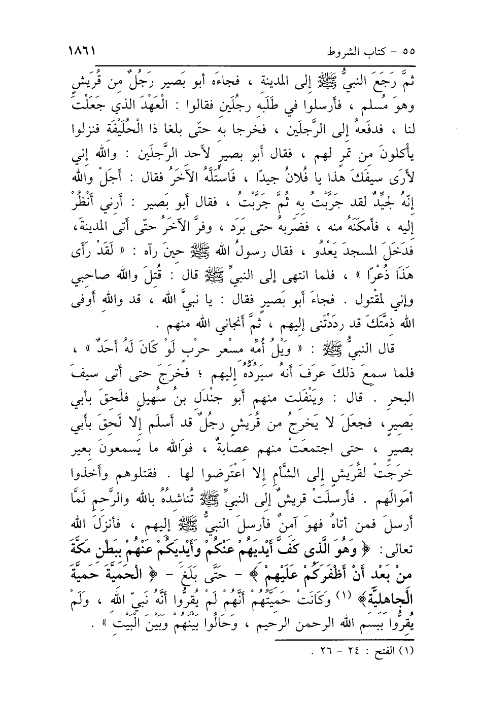 ثُمَّ رَجَعَ النَّبِيُّ صَلَّى اللهُ عَلَيْهِ وَسَلَّمَ إِلَى المَدِينَةِ، فَجَاءَهُ أَبُو بَصِيرٍ رَجُلٌ مِنْ قُرَيْشٍ وَهُوَ مُسْلِمٌ، فَأَرْسَلُوا فِي طَلَبِهِ رَجُلَيْنِ، فَقَالُوا: العَهْدَ الَّذِي جَعَلْتَ لَنَا، فَدَفَعَهُ إِلَى الرَّجُلَيْنِ، فَخَرَجَا بِهِ حَتَّى بَلَغَا ذَا الحُلَيْفَةِ، فَنَزَلُوا يَأْكُلُونَ مِنْ تَمْرٍ لَهُمْ، فَقَالَ أَبُو بَصِيرٍ لِأَحَدِ الرَّجُلَيْنِ: وَاللَّهِ إِنِّي لَأَرَى سَيْفَكَ هَذَا يَا فُلاَنُ جَيِّدًا، فَاسْتَلَّهُ الآخَرُ، فَقَالَ: أَجَلْ، وَاللَّهِ إِنَّهُ لَجَيِّدٌ، لَقَدْ جَرَّبْتُ بِهِ، ثُمَّ جَرَّبْتُ، فَقَالَ أَبُو بَصِيرٍ: أَرِنِي أَنْظُرْ إِلَيْهِ، فَأَمْكَنَهُ مِنْهُ، فَضَرَبَهُ حَتَّى بَرَدَ، وَفَرَّ الآخَرُ حَتَّى أَتَى المَدِينَةَ، فَدَخَلَ المَسْجِدَ يَعْدُو، فَقَالَ رَسُولُ اللَّهِ صَلَّى اللهُ عَلَيْهِ وَسَلَّمَ حِينَ رَآهُ: «لَقَدْ رَأَى هَذَا ذُعْرًا» فَلَمَّا انْتَهَى إِلَى النَّبِيِّ صَلَّى اللهُ عَلَيْهِ وَسَلَّمَ قَالَ: قُتِلَ وَاللَّهِ صَاحِبِي وَإِنِّي لَمَقْتُولٌ، فَجَاءَ أَبُو بَصِيرٍ فَقَالَ: يَا نَبِيَّ اللَّهِ، قَدْ وَاللَّهِ أَوْفَى اللَّهُ ذِمَّتَكَ، قَدْ رَدَدْتَنِي إِلَيْهِمْ، ثُمَّ أَنْجَانِي اللَّهُ مِنْهُمْ، قَالَ النَّبِيُّ صَلَّى اللهُ عَلَيْهِ وَسَلَّمَ: «وَيْلُ أُمِّهِ مِسْعَرَ حَرْبٍ، لَوْ كَانَ لَهُ أَحَدٌ» فَلَمَّا سَمِعَ ذَلِكَ عَرَفَ أَنَّهُ سَيَرُدُّهُ إِلَيْهِمْ، فَخَرَجَ حَتَّى أَتَى سِيفَ البَحْرِ قَالَ: وَيَنْفَلِتُ مِنْهُمْ أَبُو جَنْدَلِ بْنُ سُهَيْلٍ، فَلَحِقَ بِأَبِي بَصِيرٍ، فَجَعَلَ لاَ يَخْرُجُ مِنْ قُرَيْشٍ رَجُلٌ قَدْ أَسْلَمَ إِلَّا لَحِقَ بِأَبِي بَصِيرٍ، حَتَّى اجْتَمَعَتْ مِنْهُمْ عِصَابَةٌ، فَوَاللَّهِ مَا يَسْمَعُونَ بِعِيرٍ خَرَجَتْ لِقُرَيْشٍ إِلَى الشَّأْمِ إِلَّا اعْتَرَضُوا لَهَا، فَقَتَلُوهُمْ وَأَخَذُوا أَمْوَالَهُمْ، فَأَرْسَلَتْ قُرَيْشٌ إِلَى النَّبِيِّ صَلَّى اللهُ عَلَيْهِ وَسَلَّمَ تُنَاشِدُهُ بِاللَّهِ وَالرَّحِمِ، لَمَّا أَرْسَلَ، فَمَنْ أَتَاهُ فَهُوَ آمِنٌ، فَأَرْسَلَ النَّبِيُّ صَلَّى اللهُ عَلَيْهِ وَسَلَّمَ إِلَيْهِمْ، فَأَنْزَلَ اللَّهُ تَعَالَى: {وَهُوَ الَّذِي كَفَّ أَيْدِيَهُمْ عَنْكُمْ وَأَيْدِيَكُمْ عَنْهُمْ بِبَطْنِ مَكَّةَ مِنْ بَعْدِ أَنْ أَظْفَرَكُمْ عَلَيْهِمْ} [الفتح: 24] حَتَّى بَلَغَ {الحَمِيَّةَ حَمِيَّةَ الجَاهِلِيَّةِ} [الفتح: 26] وَكَانَتْ حَمِيَّتُهُمْ أَنَّهُمْ لَمْ يُقِرُّوا أَنَّهُ نَبِيُّ اللَّهِ، وَلَمْ يُقِرُّوا بِبِسْمِ اللَّهِ الرَّحْمَنِ الرَّحِيمِ، وَحَالُوا بَيْنَهُمْ وَبَيْنَ البَيْتِ.