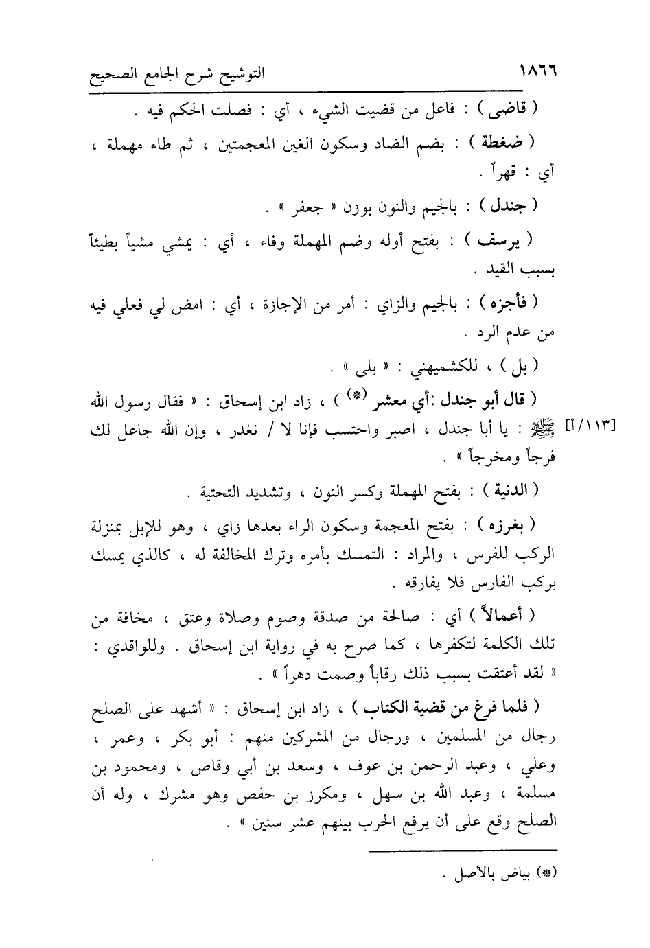 (قال أبو جندل: أي معشر) , زاد ابن إسحاق: "فقال رسول الله - صلى الله عليه وسلم -: يا أبا جندل، اصبر واحتسب فإنا لا نغدر، وإن الله جاعل لك فرجًا ومخرجًا".