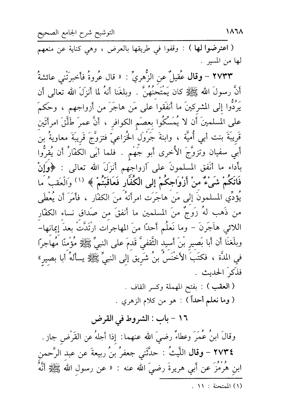 2733 - وَقَالَ عُقَيْلٌ عَنِ الزُّهْرِيِّ، قَالَ عُرْوَةُ: فَأَخْبَرَتْنِي عَائِشَةُ: أَنَّ رَسُولَ اللَّهِ صَلَّى اللهُ عَلَيْهِ وَسَلَّمَ، كَانَ يَمْتَحِنُهُنَّ وَبَلَغْنَا أَنَّهُ لَمَّا أَنْزَلَ اللَّهُ تَعَالَى: أَنْ يَرُدُّوا إِلَى المُشْرِكِينَ مَا أَنْفَقُوا عَلَى مَنْ هَاجَرَ مِنْ أَزْوَاجِهِمْ، وَحَكَمَ عَلَى المُسْلِمِينَ أَنْ لاَ يُمَسِّكُوا بِعِصَمِ الكَوَافِرِ، أَنَّ عُمَرَ طَلَّقَ امْرَأَتَيْنِ، قَرِيبَةَ بِنْتَ أَبِي أُمَيَّةَ، وَابْنَةَ جَرْوَلٍ الخُزَاعِيِّ، فَتَزَوَّجَ قَرِيبَةَ مُعَاوِيَةُ، وَتَزَوَّجَ الأُخْرَى أَبُو جَهْمٍ، فَلَمَّا أَبَى الكُفَّارُ أَنْ يُقِرُّوا بِأَدَاءِ مَا أَنْفَقَ المُسْلِمُونَ عَلَى أَزْوَاجِهِمْ، أَنْزَلَ اللَّهُ تَعَالَى: {وَإِنْ فَاتَكُمْ شَيْءٌ مِنْ أَزْوَاجِكُمْ إِلَى الكُفَّارِ فَعَاقَبْتُمْ} [الممتحنة: 11] وَالعَقْبُ مَا يُؤَدِّي المُسْلِمُونَ إِلَى مَنْ هَاجَرَتِ امْرَأَتُهُ مِنَ الكُفَّارِ، فَأَمَرَ أَنْ يُعْطَى مَنْ ذَهَبَ لَهُ زَوْجٌ مِنَ المُسْلِمِينَ مَا أَنْفَقَ مِنْ صَدَاقِ نِسَاءِ الكُفَّارِ اللَّائِي هَاجَرْنَ، وَمَا نَعْلَمُ أَنَّ أَحَدًا مِنَ الْمُهَاجِرَاتِ ارْتَدَّتْ بَعْدَ إِيمَانِهَا، وَبَلَغَنَا أَنَّ أَبَا بَصِيرِ بْنَ أَسِيدٍ الثَّقَفِيَّ قَدِمَ عَلَى النَّبِيِّ صَلَّى اللهُ عَلَيْهِ وَسَلَّمَ مُؤْمِنًا مُهَاجِرًا فِي المُدَّةِ، فَكَتَبَ الأَخْنَسُ بْنُ شَرِيقٍ إِلَى النَّبِيِّ صَلَّى اللهُ عَلَيْهِ وَسَلَّمَ يَسْأَلُهُ أَبَا بَصِيرٍ، فَذَكَرَ الحَدِيثَ.