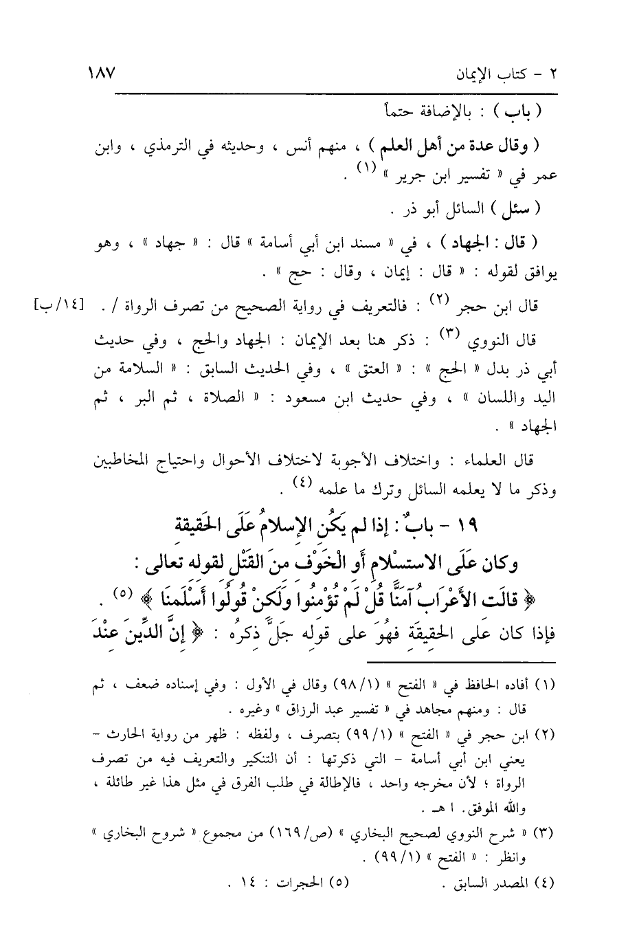 قال النووي: ذكر هنا بعد الإيمان: الجهاد والحج، وفي حديث أبي ذر بدل "الحج": "العتق"، وفي الحديث السابق: "السلامة من اليد واللسان"، وفي حديث ابن مسعود: "الصلاة، ثم البر، ثم الجهاد".