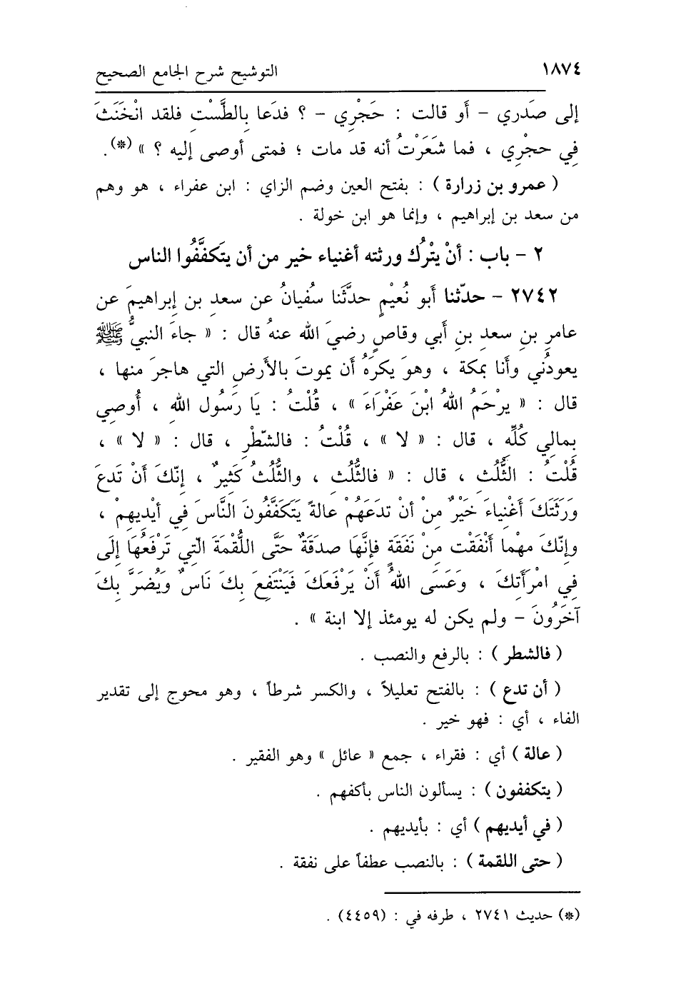 2742 - حَدَّثَنَا أَبُو نُعَيْمٍ، حَدَّثَنَا سُفْيَانُ، عَنْ سَعْدِ بْنِ إِبْرَاهِيمَ، عَنْ عَامِرِ بْنِ سَعْدٍ، عَنْ سَعْدِ بْنِ أَبِي وَقَّاصٍ رَضِيَ اللَّهُ عَنْهُ، قَالَ: جَاءَ النَّبِيُّ صَلَّى اللهُ عَلَيْهِ وَسَلَّمَ يَعُودُنِي وَأَنَا بِمَكَّةَ، وَهُوَ يَكْرَهُ أَنْ يَمُوتَ بِالأَرْضِ الَّتِي هَاجَرَ مِنْهَا، قَالَ: «يَرْحَمُ اللَّهُ ابْنَ عَفْرَاءَ»، قُلْتُ: يَا رَسُولَ اللَّهِ، أُوصِي بِمَالِي كُلِّهِ؟ قَالَ: «لاَ»، قُلْتُ: فَالشَّطْرُ، قَالَ: «لاَ»، قُلْتُ: الثُّلُثُ، قَالَ: «فَالثُّلُثُ، وَالثُّلُثُ كَثِيرٌ، إِنَّكَ أَنْ تَدَعَ وَرَثَتَكَ أَغْنِيَاءَ خَيْرٌ مِنْ أَنْ تَدَعَهُمْ عَالَةً يَتَكَفَّفُونَ النَّاسَ فِي أَيْدِيهِمْ، وَإِنَّكَ مَهْمَا أَنْفَقْتَ مِنْ نَفَقَةٍ، فَإِنَّهَا صَدَقَةٌ، حَتَّى اللُّقْمَةُ الَّتِي تَرْفَعُهَا إِلَى فِي امْرَأَتِكَ، وَعَسَى اللَّهُ أَنْ يَرْفَعَكَ، فَيَنْتَفِعَ بِكَ نَاسٌ وَيُضَرَّ بِكَ آخَرُونَ»، وَلَمْ يَكُنْ لَهُ يَوْمَئِذٍ إِلَّا ابْنَةٌ.