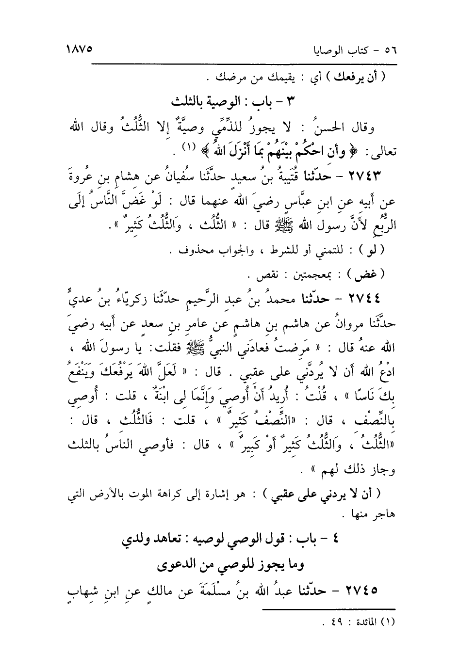 2743 - حَدَّثَنَا قُتَيْبَةُ بْنُ سَعِيدٍ، حَدَّثَنَا سُفْيَانُ، عَنْ هِشَامِ بْنِ عُرْوَةَ، عَنْ أَبِيهِ، عَنِ ابْنِ عَبَّاسٍ رَضِيَ اللَّهُ عَنْهُمَا، قَالَ: لَوْ غَضَّ النَّاسُ إِلَى الرُّبْعِ، لِأَنَّ رَسُولَ اللَّهِ صَلَّى اللهُ عَلَيْهِ وَسَلَّمَ قَالَ: «الثُّلُثُ وَالثُّلُثُ كَثِيرٌ أَوْ كَبِيرٌ».