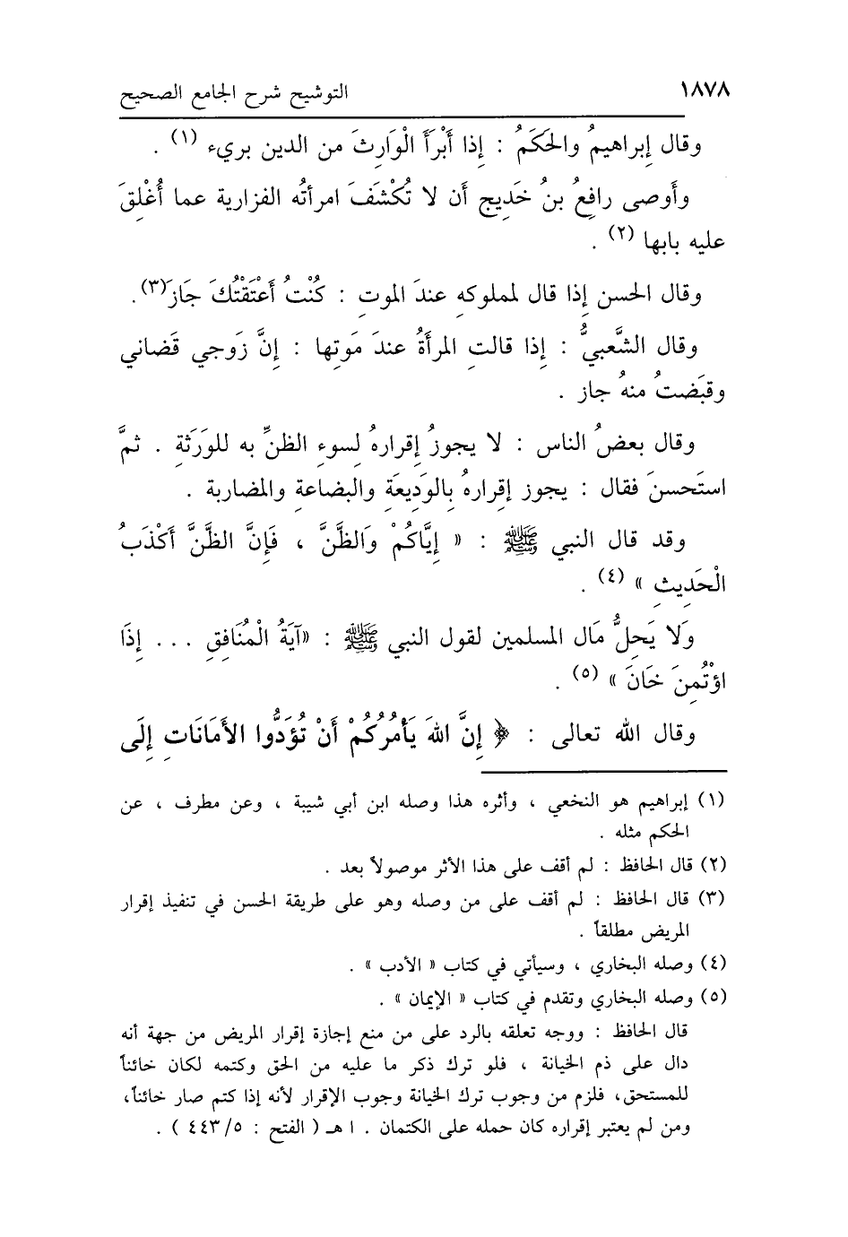 وَقَالَ إِبْرَاهِيمُ: وَالحَكَمُ: «إِذَا أَبْرَأَ الوَارِثَ مِنَ الدَّيْنِ بَرِئَ» وَأَوْصَى رَافِعُ بْنُ خَدِيجٍ: «أَنْ لاَ تُكْشَفَ امْرَأَتُهُ الفَزَارِيَّةُ عَمَّا أُغْلِقَ عَلَيْهِ بَابُهَا» وَقَالَ الحَسَنُ: " إِذَا قَالَ لِمَمْلُوكِهِ عِنْدَ المَوْتِ: كُنْتُ أَعْتَقْتُكَ، جَازَ " وَقَالَ الشَّعْبِيُّ: " إِذَا قَالَتِ المَرْأَةُ عِنْدَ مَوْتِهَا: إِنَّ زَوْجِي قَضَانِي وَقَبَضْتُ مِنْهُ جَازَ " وَقَالَ بَعْضُ النَّاسِ: لاَ يَجُوزُ إِقْرَارُهُ لِسُوءِ الظَّنِّ بِهِ لِلْوَرَثَةِ، ثُمَّ اسْتَحْسَنَ، فَقَالَ: يَجُوزُ إِقْرَارُهُ بِالوَدِيعَةِ وَالبِضَاعَةِ وَالمُضَارَبَةِ " وَقَدْ قَالَ النَّبِيُّ صَلَّى اللهُ عَلَيْهِ وَسَلَّمَ: «إِيَّاكُمْ وَالظَّنَّ، فَإِنَّ الظَّنَّ أَكْذَبُ الحَدِيثِ» وَلاَ يَحِلُّ مَالُ المُسْلِمِينَ " لِقَوْلِ النَّبِيِّ صَلَّى اللهُ عَلَيْهِ وَسَلَّمَ: " آيَةُ المُنَافِقِ: إِذَا اؤْتُمِنَ خَانَ " وَقَالَ اللَّهُ تَعَالَى: {إِنَّ اللَّهَ يَأْمُرُكُمْ أَنْ تُؤَدُّوا الأَمَانَاتِ إِلَى