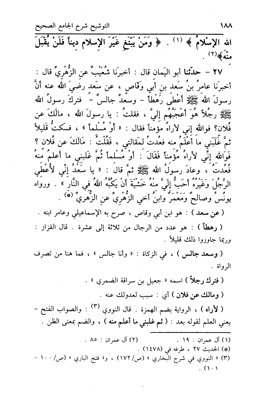 27 - حَدَّثَنَا أَبُو اليَمَانِ، قَالَ: أَخْبَرَنَا شُعَيْبٌ، عَنِ الزُّهْرِيِّ، قَالَ: أَخْبَرَنِي عَامِرُ بْنُ سَعْدِ بْنِ أَبِي وَقَّاصٍ، عَنْ سَعْدٍ رَضِيَ اللَّهُ عَنْهُ، أَنَّ رَسُولَ اللَّهِ صَلَّى اللهُ عَلَيْهِ وَسَلَّمَ أَعْطَى رَهْطًا وَسَعْدٌ جَالِسٌ، فَتَرَكَ رَسُولُ اللَّهِ صَلَّى اللهُ عَلَيْهِ وَسَلَّمَ رَجُلًا هُوَ أَعْجَبُهُمْ إِلَيَّ، فَقُلْتُ: يَا رَسُولَ اللَّهِ مَا لَكَ عَنْ فُلاَنٍ فَوَاللَّهِ إِنِّي لَأَرَاهُ مُؤْمِنًا، فَقَالَ: «أَوْ مُسْلِمًا» فَسَكَتُّ قَلِيلًا، ثُمَّ غَلَبَنِي مَا أَعْلَمُ مِنْهُ، فَعُدْتُ لِمَقَالَتِي، فَقُلْتُ: مَا لَكَ عَنْ فُلاَنٍ؟ فَوَاللَّهِ إِنِّي لَأَرَاهُ مُؤْمِنًا، فَقَالَ: «أَوْ مُسْلِمًا». ثُمَّ غَلَبَنِي مَا أَعْلَمُ مِنْهُ فَعُدْتُ لِمَقَالَتِي، وَعَادَ رَسُولُ اللَّهِ صَلَّى اللهُ عَلَيْهِ وَسَلَّمَ، ثُمَّ قَالَ: «يَا سَعْدُ إِنِّي لَأُعْطِي الرَّجُلَ، وَغَيْرُهُ أَحَبُّ إِلَيَّ مِنْهُ، خَشْيَةَ أَنْ يَكُبَّهُ اللَّهُ فِي النَّارِ» وَرَوَاهُ يُونُسُ، وَصَالِحٌ، وَمَعْمَرٌ، وَابْنُ أَخِي الزُّهْرِيِّ، عَنِ الزُّهْرِيِّ.