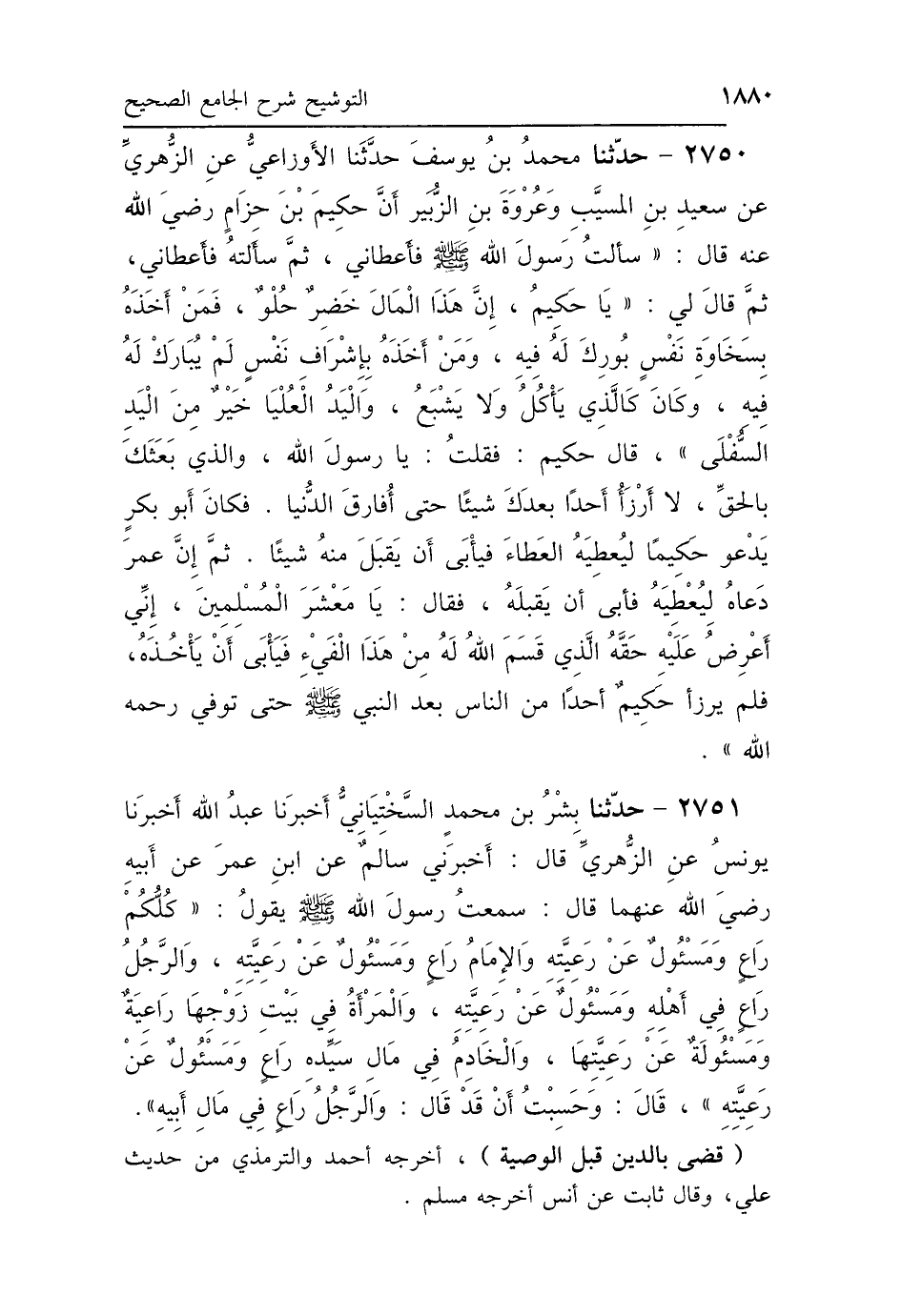 2750 - حَدَّثَنَا مُحَمَّدُ بْنُ يُوسُفَ، حَدَّثَنَا الأَوْزَاعِيُّ، عَنِ الزُّهْرِيِّ، عَنْ سَعِيدِ بْنِ المُسَيِّبِ، وَعُرْوَةَ بْنِ الزُّبَيْرِ، أَنَّ حَكِيمَ بْنَ حِزَامٍ رَضِيَ اللَّهُ عَنْهُ، قَالَ: سَأَلْتُ رَسُولَ اللَّهِ صَلَّى اللهُ عَلَيْهِ وَسَلَّمَ، فَأَعْطَانِي ثُمَّ سَأَلْتُهُ، فَأَعْطَانِي ثُمَّ قَالَ لِي: «يَا حَكِيمُ، إِنَّ هَذَا المَالَ خَضِرٌ حُلْوٌ، فَمَنْ أَخَذَهُ بِسَخَاوَةِ نَفْسٍ، بُورِكَ لَهُ فِيهِ وَمَنْ أَخَذَهُ بِإِشْرَافِ نَفْسٍ، لَمْ يُبَارَكْ لَهُ فِيهِ، وَكَانَ كَالَّذِي يَأْكُلُ وَلاَ يَشْبَعُ، وَاليَدُ العُلْيَا خَيْرٌ مِنَ اليَدِ السُّفْلَى»، قَالَ حَكِيمٌ: فَقُلْتُ: يَا رَسُولَ اللَّهِ، وَالَّذِي بَعَثَكَ بِالحَقِّ لاَ أَرْزَأُ أَحَدًا بَعْدَكَ شَيْئًا حَتَّى أُفَارِقَ الدُّنْيَا، فَكَانَ أَبُو بَكْرٍ يَدْعُو حَكِيمًا لِيُعْطِيَهُ العَطَاءَ، فَيَأْبَى أَنْ يَقْبَلَ مِنْهُ شَيْئًا، ثُمَّ إِنَّ عُمَرَ دَعَاهُ لِيُعْطِيَهُ، فَيَأْبَى أَنْ يَقْبَلَهُ، فَقَالَ: يَا مَعْشَرَ المُسْلِمِينَ، إِنِّي أَعْرِضُ عَلَيْهِ حَقَّهُ، الَّذِي قَسَمَ اللَّهُ لَهُ مِنْ هَذَا الفَيْءِ، فَيَأْبَى أَنْ يَأْخُذَهُ، فَلَمْ يَرْزَأْ حَكِيمٌ أَحَدًا مِنَ النَّاسِ بَعْدَ النَّبِيِّ صَلَّى اللهُ عَلَيْهِ وَسَلَّمَ حَتَّى تُوُفِّيَ رَحِمَهُ اللَّهُ.