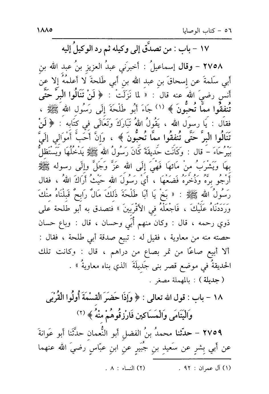 2758 - وَقَالَ إِسْمَاعِيلُ: أَخْبَرَنِي عَبْدُ العَزِيزِ بْنُ عَبْدِ اللَّهِ بْنِ أَبِي سَلَمَةَ، عَنْ إِسْحَاقَ بْنِ عَبْدِ اللَّهِ بْنِ أَبِي طَلْحَةَ لاَ أَعْلَمُهُ إِلَّا عَنْ أَنَسٍ رَضِيَ اللَّهُ عَنْهُ قَالَ: لَمَّا نَزَلَتْ: {لَنْ تَنَالُوا البِرَّ حَتَّى تُنْفِقُوا مِمَّا تُحِبُّونَ} [آل عمران: 92] جَاءَ أَبُو طَلْحَةَ إِلَى رَسُولِ اللَّهِ صَلَّى اللهُ عَلَيْهِ وَسَلَّمَ فَقَالَ: يَا رَسُولَ اللَّهِ يَقُولُ اللَّهُ تَبَارَكَ وَتَعَالَى فِي كِتَابِهِ: {لَنْ تَنَالُوا البِرَّ حَتَّى تُنْفِقُوا مِمَّا تُحِبُّونَ} [آل عمران: 92] وَإِنَّ أَحَبَّ أَمْوَالِي إِلَيَّ بَيْرُحَاءَ، قَالَ: - وَكَانَتْ حَدِيقَةً كَانَ رَسُولُ اللَّهِ صَلَّى اللهُ عَلَيْهِ وَسَلَّمَ يَدْخُلُهَا، وَيَسْتَظِلُّ بِهَا وَيَشْرَبُ مِنْ مَائِهَا -، فَهِيَ إِلَى اللَّهِ عَزَّ وَجَلَّ وَإِلَى رَسُولِهِ صَلَّى اللهُ عَلَيْهِ وَسَلَّمَ، أَرْجُو بِرَّهُ وَذُخْرَهُ، فَضَعْهَا أَيْ رَسُولَ اللَّهِ حَيْثُ أَرَاكَ اللَّهُ، فَقَالَ رَسُولُ اللَّهِ صَلَّى اللهُ عَلَيْهِ وَسَلَّمَ: «بَخْ يَا أَبَا طَلْحَةَ ذَلِكَ مَالٌ رَابِحٌ، قَبِلْنَاهُ مِنْكَ، وَرَدَدْنَاهُ عَلَيْكَ، فَاجْعَلْهُ فِي الأَقْرَبِينَ»، فَتَصَدَّقَ بِهِ أَبُو طَلْحَةَ عَلَى ذَوِي رَحِمِهِ، قَالَ: وَكَانَ مِنْهُمْ أُبَيٌّ، وَحَسَّانُ، قَالَ: وَبَاعَ حَسَّانُ حِصَّتَهُ مِنْهُ مِنْ مُعَاوِيَةَ، فَقِيلَ لَهُ: تَبِيعُ صَدَقَةَ أَبِي طَلْحَةَ، فَقَالَ: أَلاَ أَبِيعُ صَاعًا مِنْ تَمْرٍ بِصَاعٍ مِنْ دَرَاهِمَ، قَالَ: وَكَانَتْ تِلْكَ الحَدِيقَةُ فِي مَوْضِعِ قَصْرِ بَنِي حُدَيْلَةَ الَّذِي بَنَاهُ مُعَاوِيَةُ.