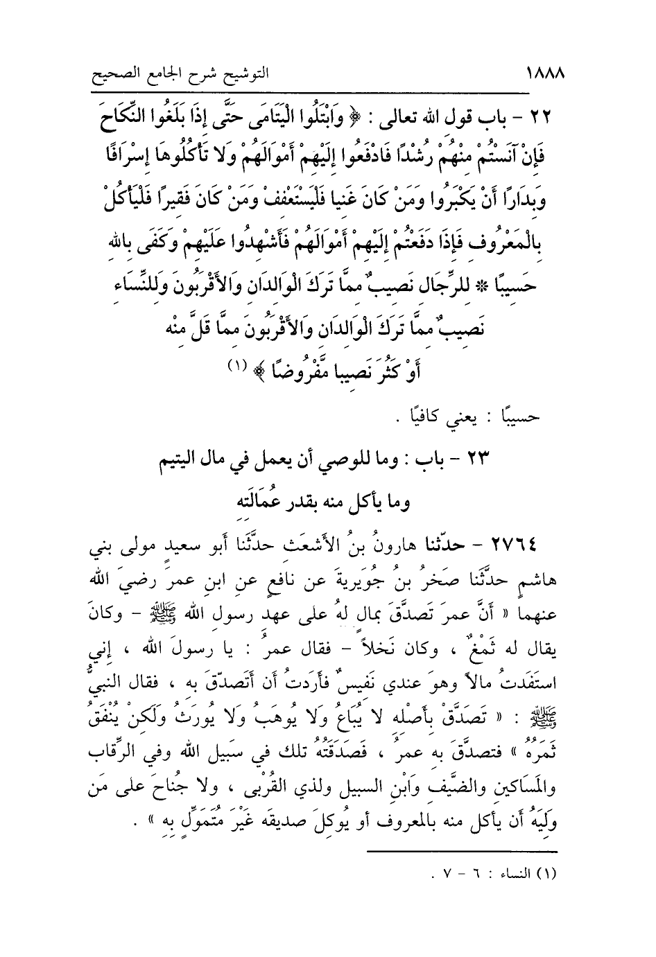 22 - بَابُ قَوْلِ اللَّهِ تَعَالَى: {وَابْتَلُوا اليَتَامَى حَتَّى إِذَا بَلَغُوا النِّكَاحَ، فَإِنْ آنَسْتُمْ مِنْهُمْ رُشْدًا فَادْفَعُوا إِلَيْهِمْ أَمْوَالَهُمْ، وَلاَ تَأْكُلُوهَا إِسْرَافًا وَبِدَارًا أَنْ يَكْبَرُوا، وَمَنْ كَانَ غَنِيًّا فَلْيَسْتَعْفِفْ وَمَنْ كَانَ فَقِيرًا فَلْيَأْكُلْ بِالْمَعْرُوفِ، فَإِذَا دَفَعْتُمْ إِلَيْهِمْ أَمْوَالَهُمْ فَأَشْهِدُوا عَلَيْهِمْ وَكَفَى بِاللَّهِ حَسِيبًا، لِلرِّجَالِ نَصِيبٌ مِمَّا تَرَكَ الوَالِدَانِ وَالأَقْرَبُونَ، وَلِلنِّسَاءِ نَصِيبٌ مِمَّا تَرَكَ الوَالِدَانِ، وَالأَقْرَبُونَ مِمَّا قَلَّ مِنْهُ أَوْ كَثُرَ [ص:10] نَصِيبًا مَفْرُوضًا} [النساء: 7]