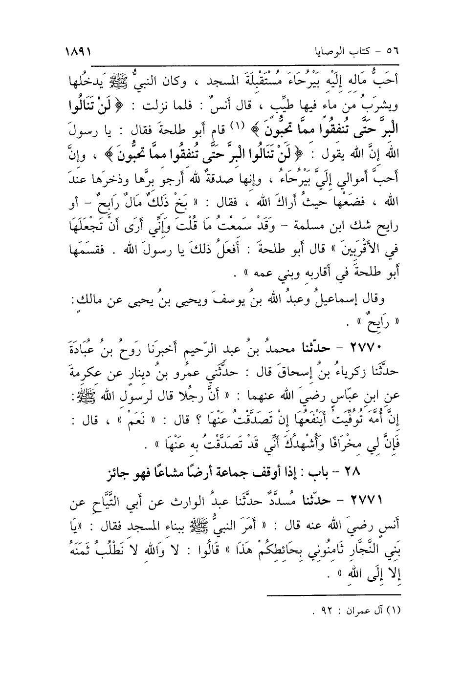 أَحَبُّ مَالِهِ إِلَيْهِ بَيْرُحَاءَ، مُسْتَقْبِلَةَ المَسْجِدِ وَكَانَ النَّبِيُّ صَلَّى اللهُ عَلَيْهِ وَسَلَّمَ يَدْخُلُهَا وَيَشْرَبُ مِنْ مَاءٍ فِيهَا طَيِّبٍ، قَالَ أَنَسٌ: فَلَمَّا نَزَلَتْ: {لَنْ تَنَالُوا البِرَّ حَتَّى تُنْفِقُوا مِمَّا تُحِبُّونَ} [آل عمران: 92]، قَامَ أَبُو طَلْحَةَ فَقَالَ: يَا رَسُولَ اللَّهِ، إِنَّ اللَّهَ يَقُولُ: {لَنْ تَنَالُوا البِرَّ حَتَّى تُنْفِقُوا مِمَّا تُحِبُّونَ} [آل عمران: 92] وَإِنَّ أَحَبَّ أَمْوَالِي إِلَيَّ بَيْرُحَاءَ، وَإِنَّهَا صَدَقَةٌ لِلَّهِ أَرْجُو بِرَّهَا وَذُخْرَهَا عِنْدَ اللَّهِ، فَضَعْهَا حَيْثُ أَرَاكَ اللَّهُ، فَقَالَ: «بَخْ، ذَلِكَ مَالٌ رَابِحٌ أَوْ رَايِحٌ - شَكَّ ابْنُ مَسْلَمَةَ - وَقَدْ سَمِعْتُ مَا قُلْتَ، وَإِنِّي أَرَى أَنْ تَجْعَلَهَا فِي الأَقْرَبِينَ»، قَالَ أَبُو طَلْحَةَ: أَفْعَلُ ذَلِكَ يَا رَسُولَ اللَّهِ، فَقَسَمَهَا أَبُو طَلْحَةَ فِي أَقَارِبِهِ، وَفِي بَنِي عَمِّهِ، وَقَالَ إِسْمَاعِيلُ، وَعَبْدُ اللَّهِ بْنُ يُوسُفَ، وَيَحْيَى بْنُ يَحْيَى: عَنْ مَالِكٍ: «رَايِحٌ».