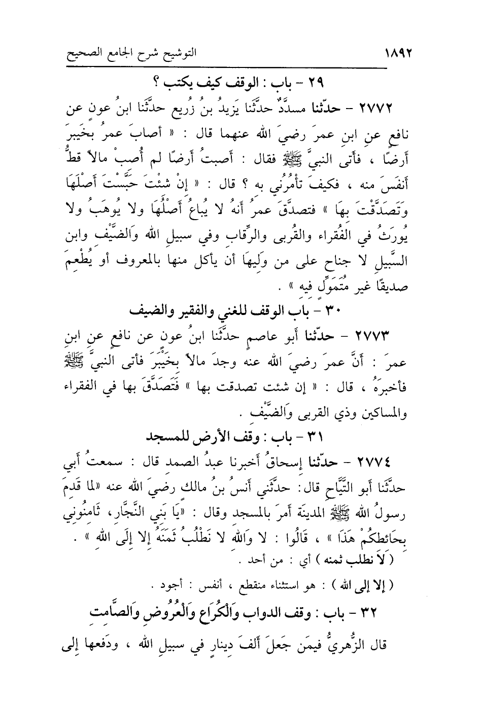 2772 - حَدَّثَنَا مُسَدَّدٌ، حَدَّثَنَا يَزِيدُ بْنُ زُرَيْعٍ، حَدَّثَنَا ابْنُ عَوْنٍ، عَنْ نَافِعٍ، عَنِ ابْنِ عُمَرَ رَضِيَ اللَّهُ عَنْهُمَا، قَالَ: أَصَابَ عُمَرُ بِخَيْبَرَ أَرْضًا، فَأَتَى النَّبِيَّ صَلَّى اللهُ عَلَيْهِ وَسَلَّمَ، فَقَالَ: أَصَبْتُ أَرْضًا لَمْ أُصِبْ مَالًا قَطُّ أَنْفَسَ مِنْهُ، فَكَيْفَ تَأْمُرُنِي بِهِ؟ قَالَ: «إِنْ شِئْتَ حَبَّسْتَ أَصْلَهَا وَتَصَدَّقْتَ بِهَا»، فَتَصَدَّقَ عُمَرُ أَنَّهُ لاَ يُبَاعُ أَصْلُهَا وَلاَ يُوهَبُ وَلاَ يُورَثُ فِي الفُقَرَاءِ، وَالقُرْبَى وَالرِّقَابِ وَفِي سَبِيلِ اللَّهِ وَالضَّيْفِ وَابْنِ السَّبِيلِ، لاَ جُنَاحَ عَلَى مَنْ وَلِيَهَا أَنْ يَأْكُلَ مِنْهَا بِالْمَعْرُوفِ، أَوْ يُطْعِمَ صَدِيقًا غَيْرَ مُتَمَوِّلٍ فِيهِ.